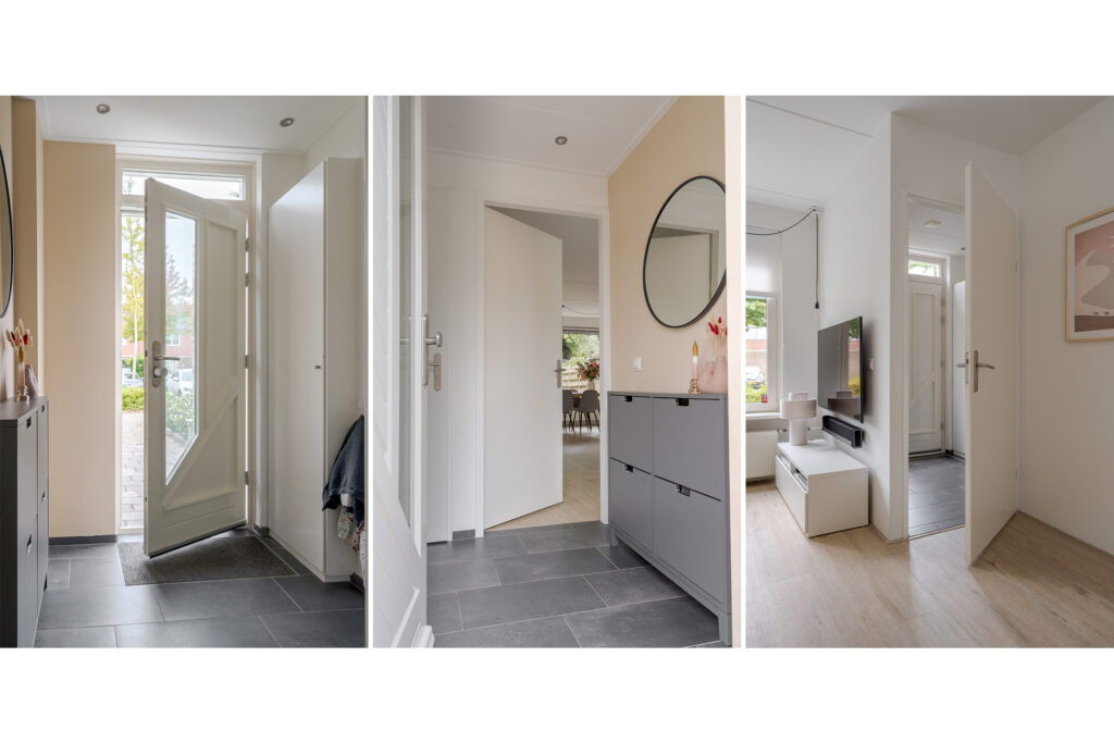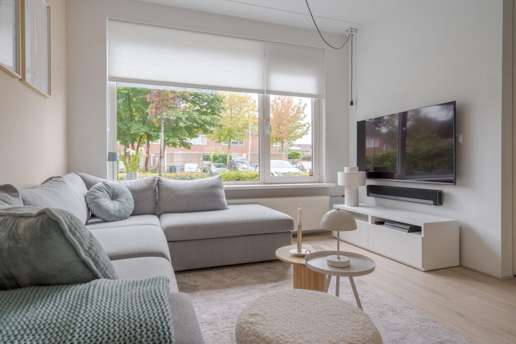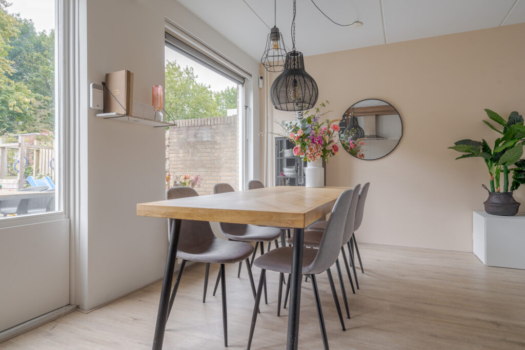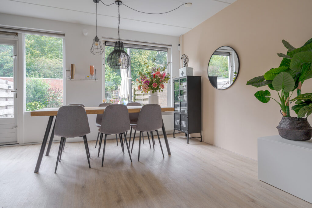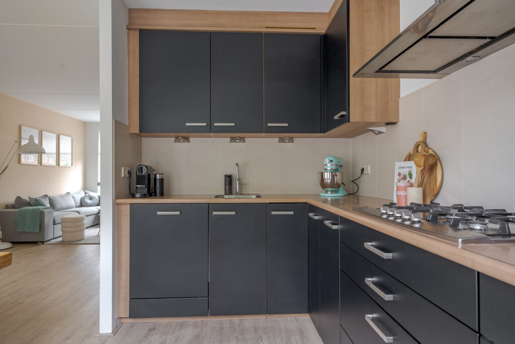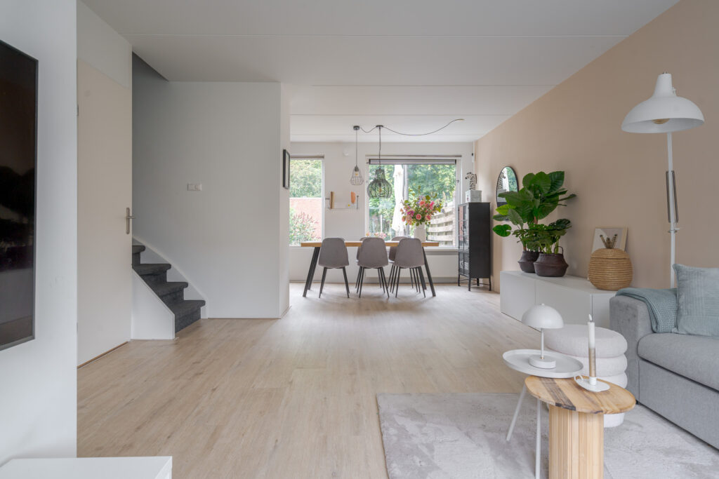 Via de voortuin bereikt u de entree met meterkast, hal en een modern toilet. De lichte en open woonkamer biedt volop leefruimte en beschikt over een provisiekast onder de trap. Aan de achterzijde bevindt zich de keuken, uitgevoerd in een moderne stijl met zwarte fronten en houten accenten. De keuken is voorzien van diverse inbouwapparatuur en biedt via een openslaande deur direct toegang tot de tuin. Grote raampartijen zorgen voor een aangename lichtinval en een fijn uitzicht op het groen.