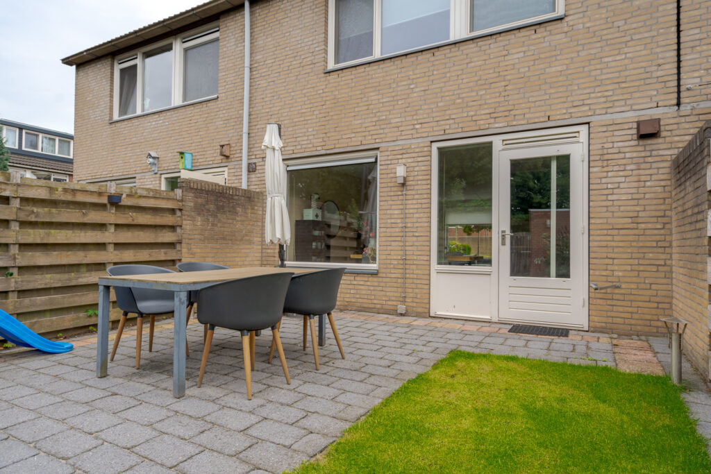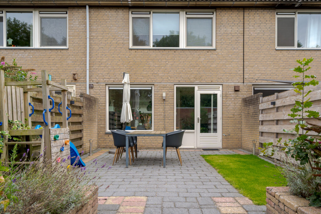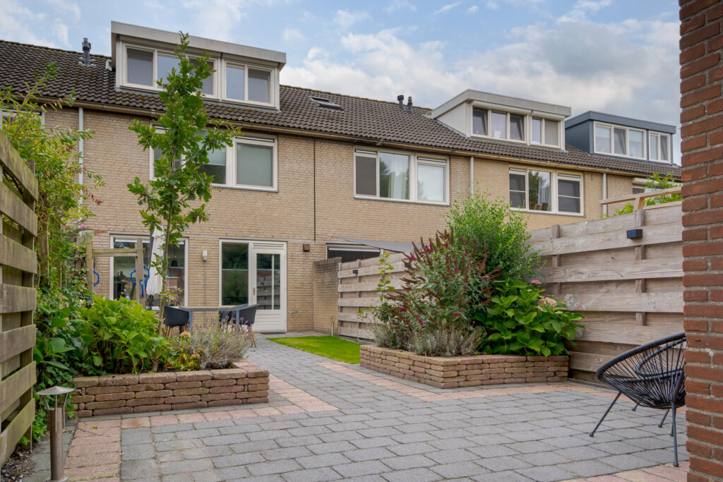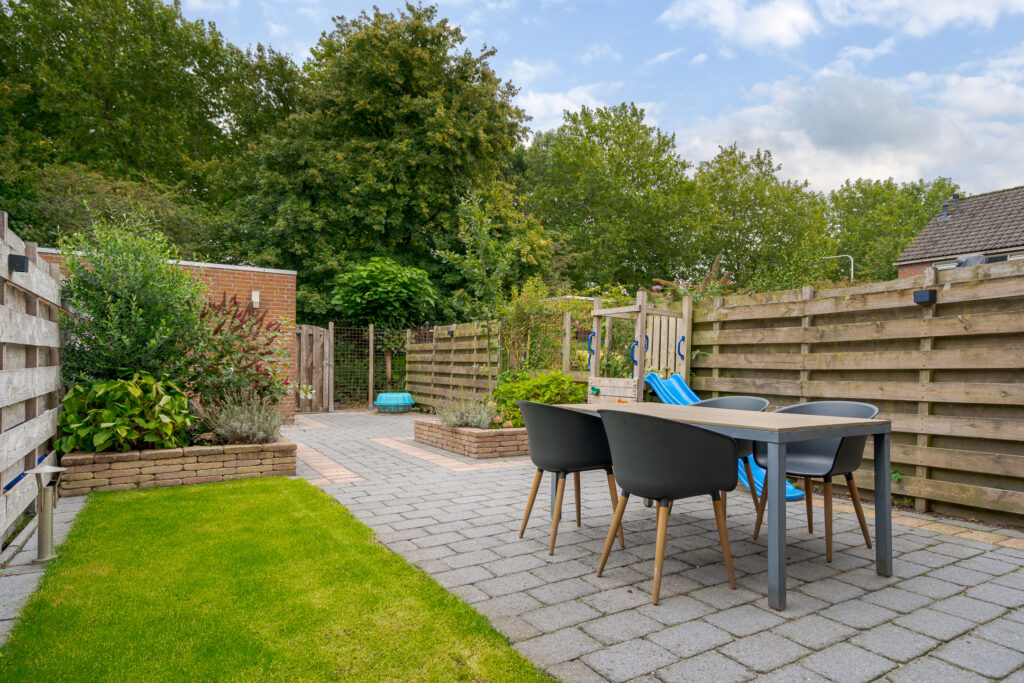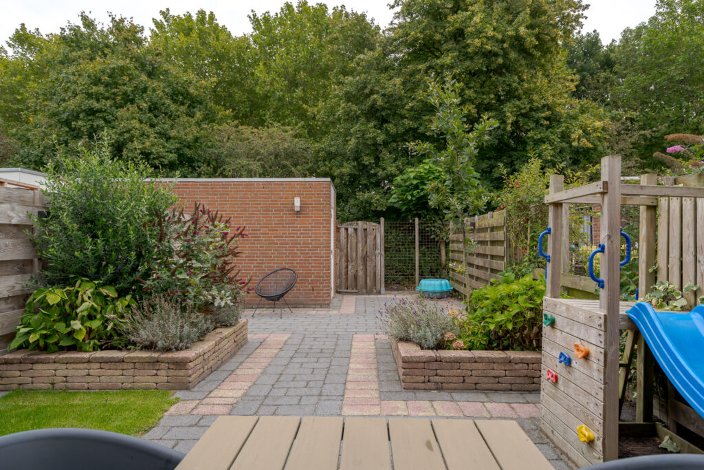 De achtertuin is verzorgd aangelegd met een combinatie van groen en bestrating, en beschikt over een praktische achterom.