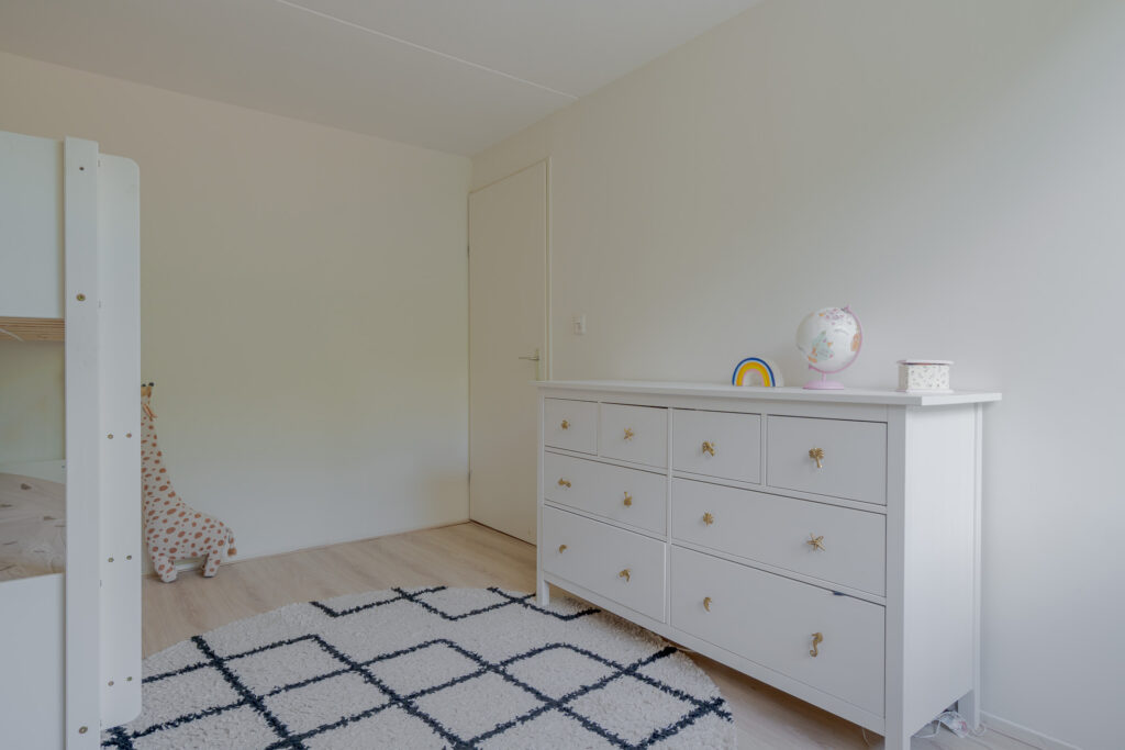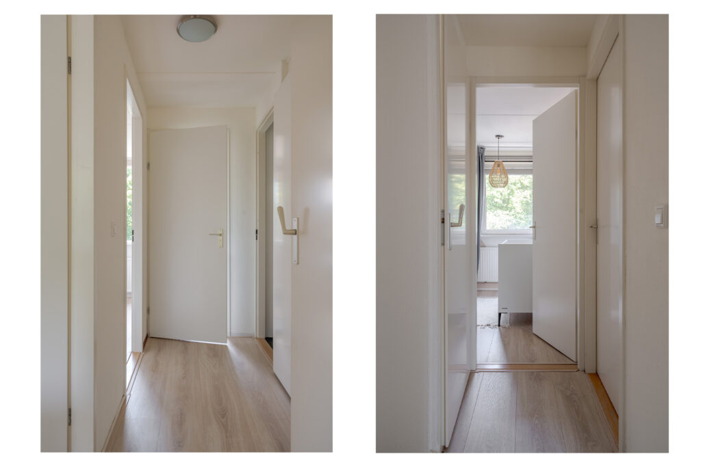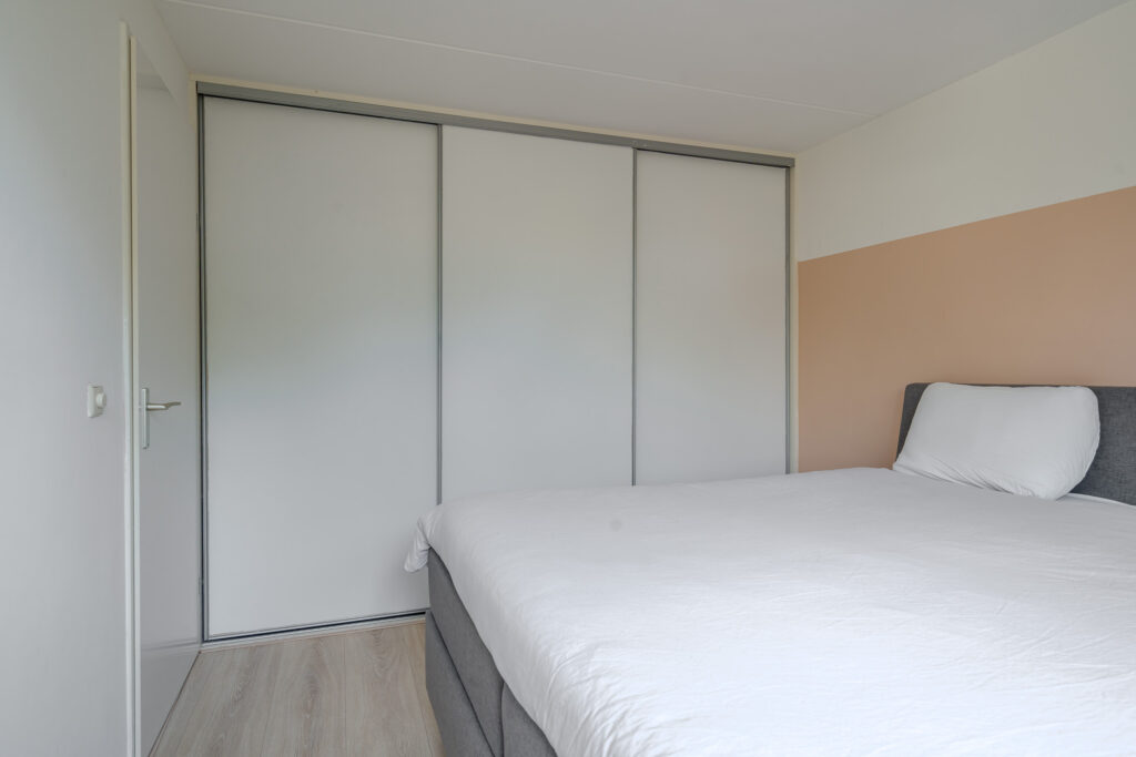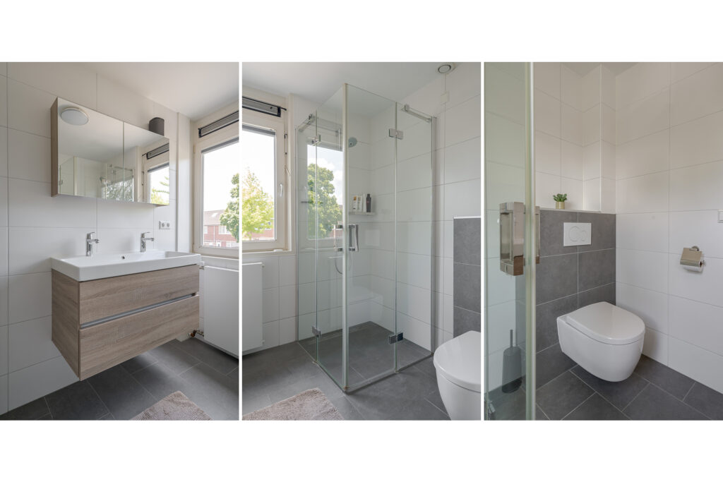 Op de eerste verdieping bevinden zich drie volwaardige slaapkamers. De slaapkamer aan de voorzijde beschikt over een vaste kast. De badkamer is uitgerust met een ruime inloopdouche, een dubbele wastafel met meubel en een tweede toilet. De twee achtergelegen slaapkamers hebben uitzicht op de tuinzijde.