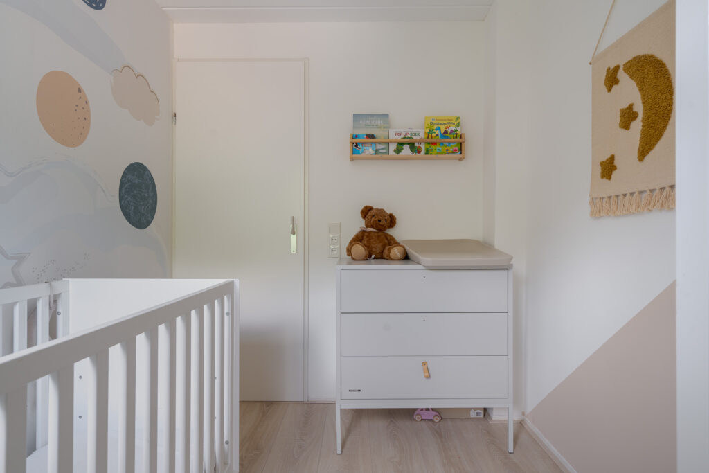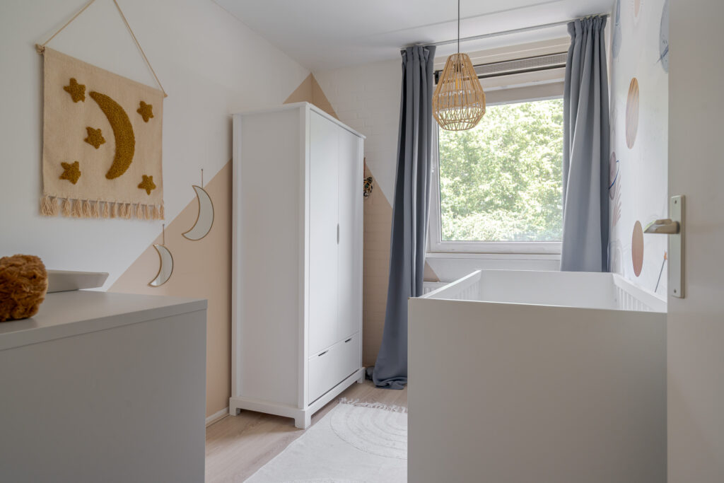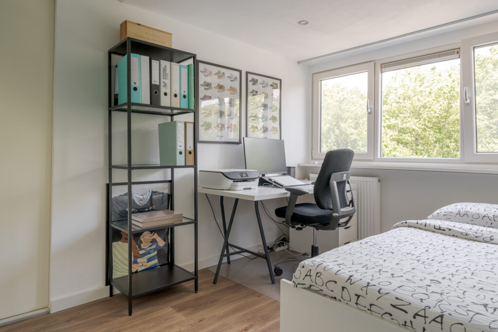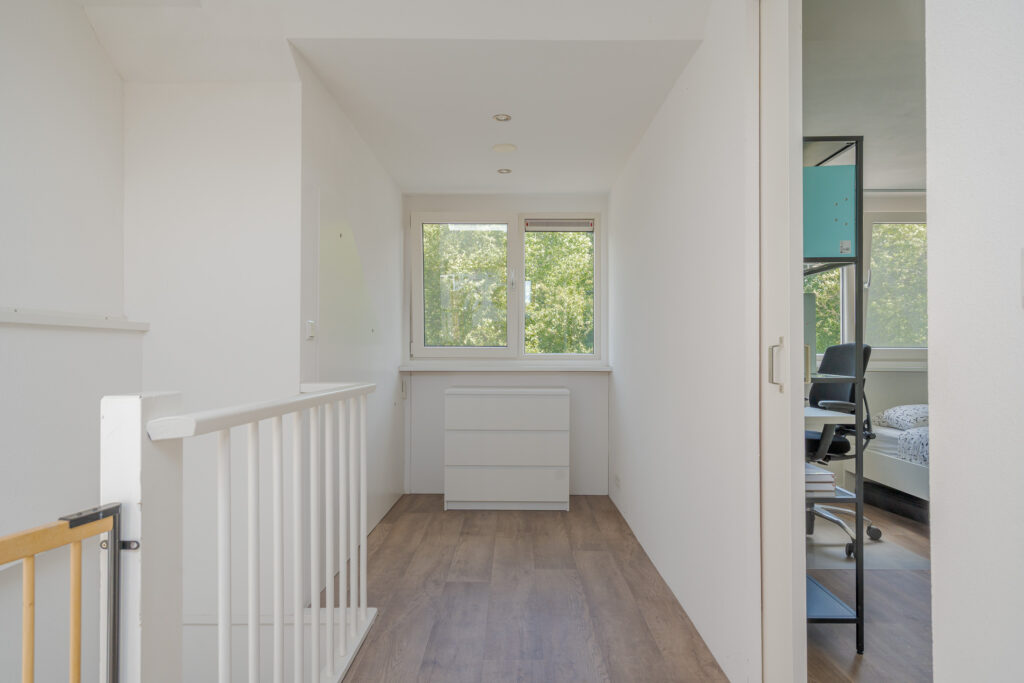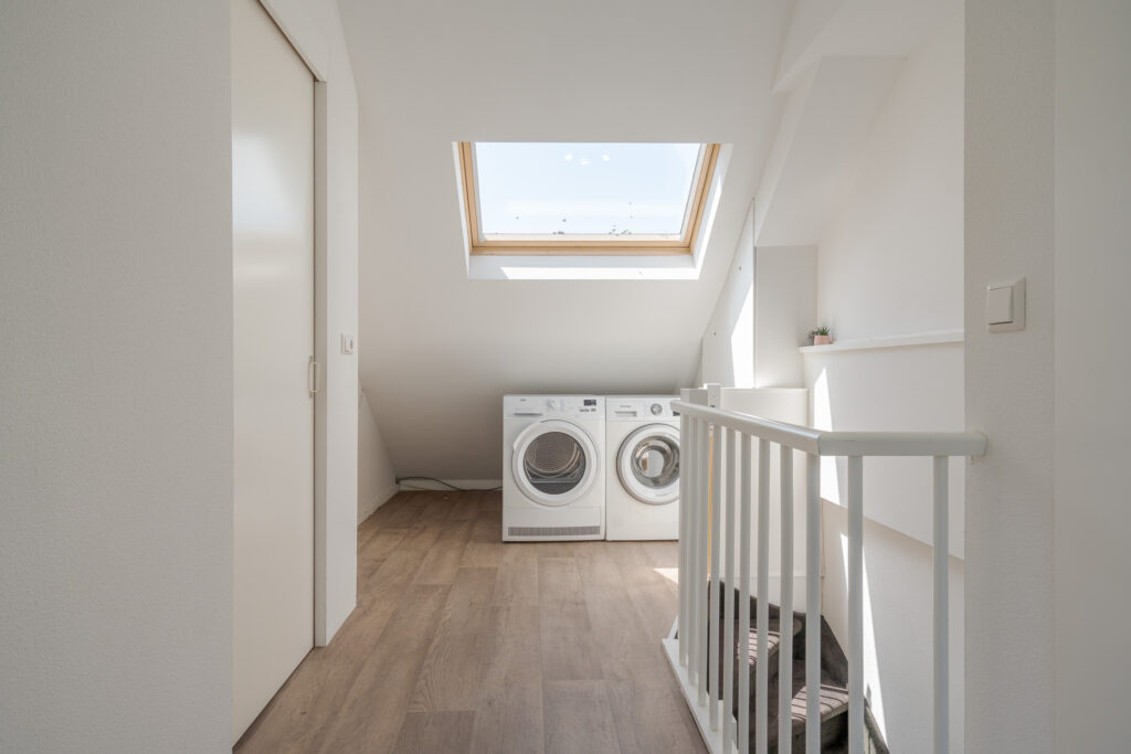 De tweede verdieping is bereikbaar via een vaste trap en beschikt over een overloop met wasruimte, cv-installatie en extra bergruimte. Dankzij het dakraam en de brede dakkapel aan de achterzijde is ook hier een volwaardige vierde slaapkamer gerealiseerd, die baadt in het daglicht.