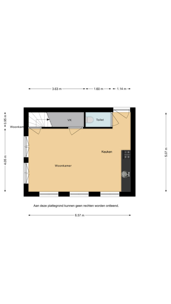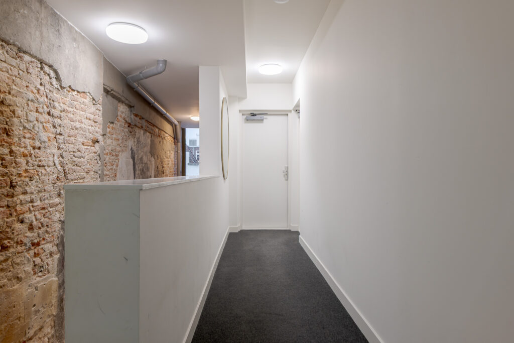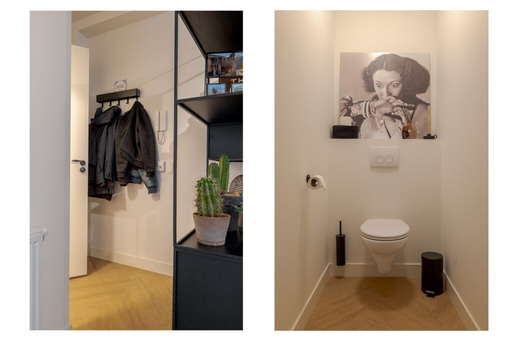 Bij binnenkomst op de eerste woonlaag valt direct het ruimtelijke gevoel op. De lichte woonkamer, voorzien van grote raampartijen met openslaande deuren en twee Franse balkons, vormt samen met de moderne open keuken een aantrekkelijke leefruimte. De keuken is strak afgewerkt en beschikt diverse inbouwapparatuur en een prettige hoeveelheid kast- en werkruimte. Vanuit de hal is het separate toilet bereikbaar. Een praktische vaste kast biedt extra bergruimte op deze etage. De toegang naar de slaapkamer is prachtig verscholen in de wand waardoor de ruimte een rustige uitstraling behoudt.