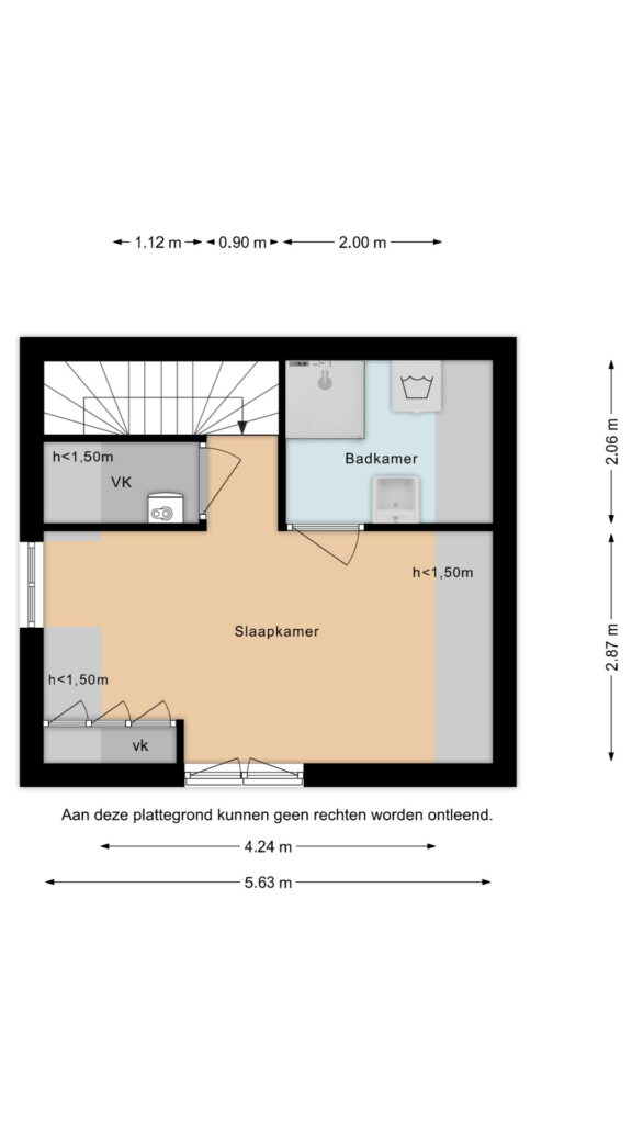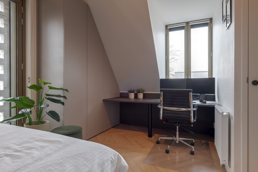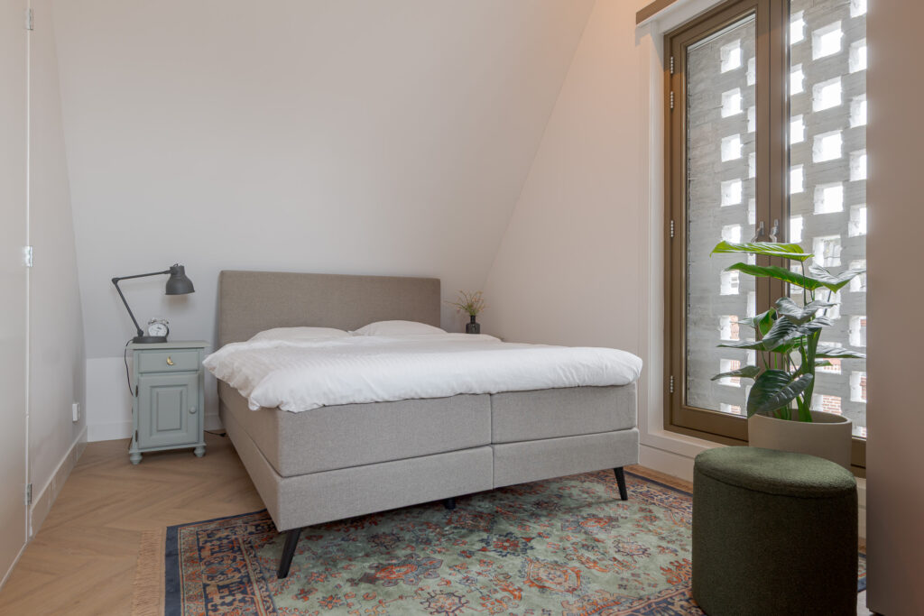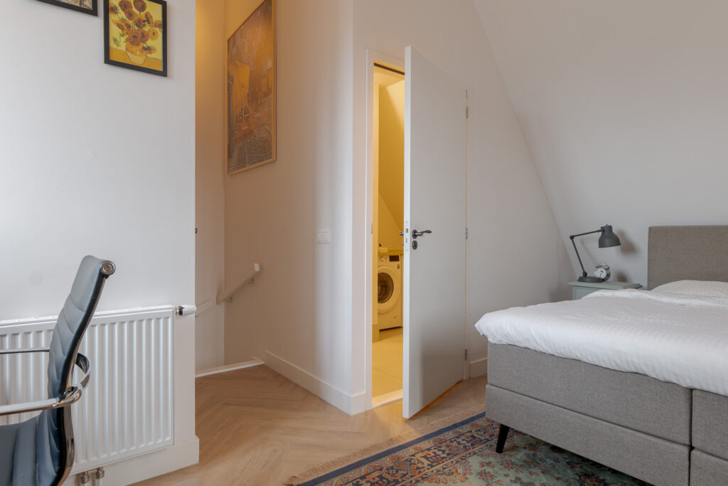 De bovenverdieping is ingericht als royale slaapkamer, en werkruimte met speelse kapvorm. De dakkapel zorgt voor zowel licht, alsook een fijne werkplek met uitzicht op de Peperbus! De verdieping is slim ingedeeld en biedt opbergmogelijkheden in de op maat gemaakte vaste kast onder de schuine wand en in de stookruimte. Dankzij de airconditioning is het hier in de zomermaanden heerlijk koel.