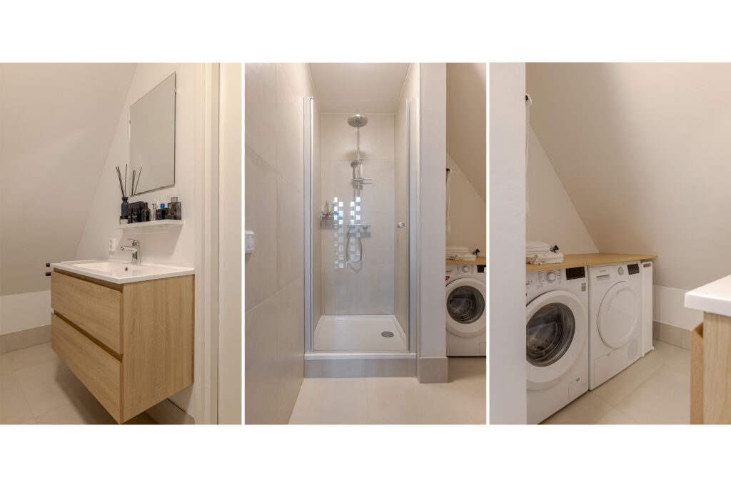 De badkamer is modern uitgevoerd en beschikt over een inloopdouche, wastafelmeubel en aansluitingen voor wasmachine en droger.