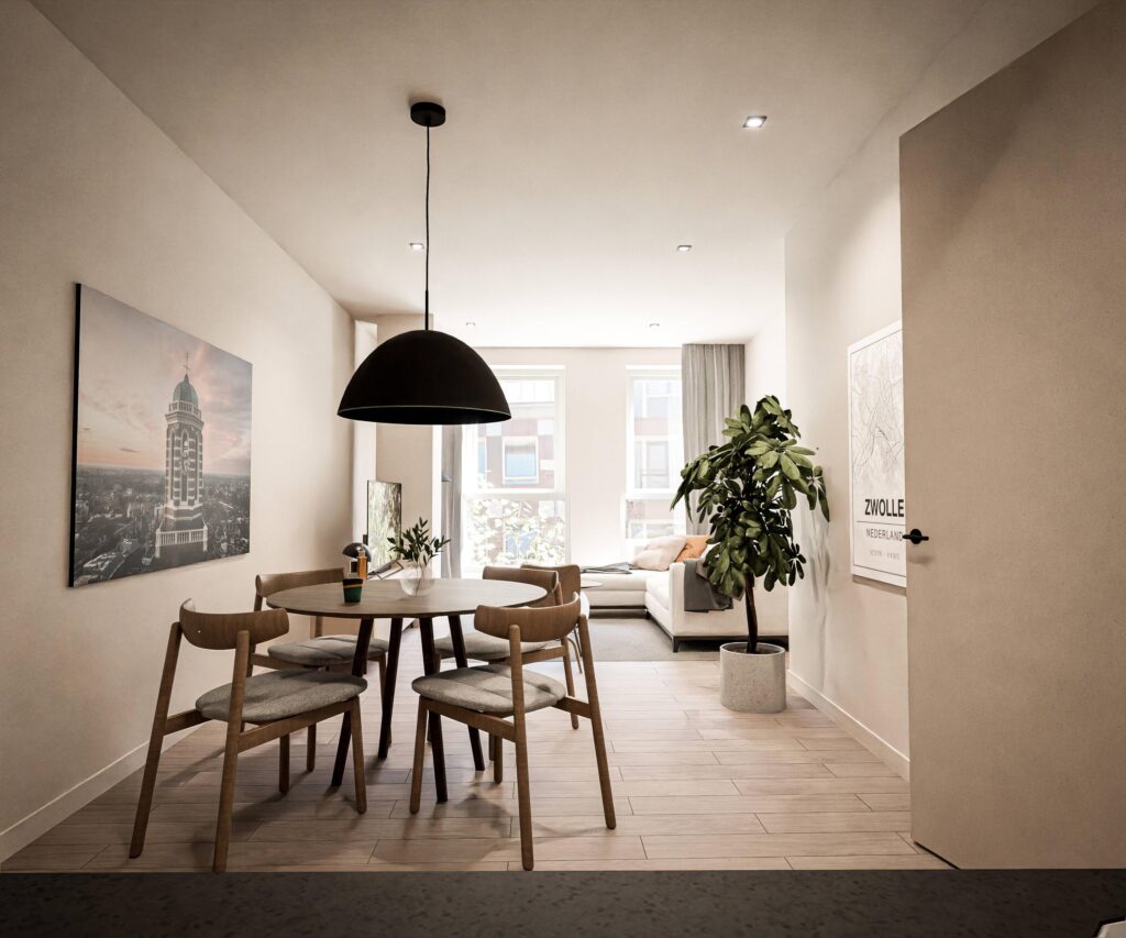 De architectuur van Het Weverskwartier is zorgvuldig ontworpen met oog voor de historische omgeving: karaktervolle gevels, kapvormen en materialen die passen bij het Zwolse straatbeeld. Je woont hier straks in een comfortabel nieuw appartement, met alle voordelen van nieuwbouw, maar met de warme en karakteristieke uitstraling die zo goed past bij de binnenstad.