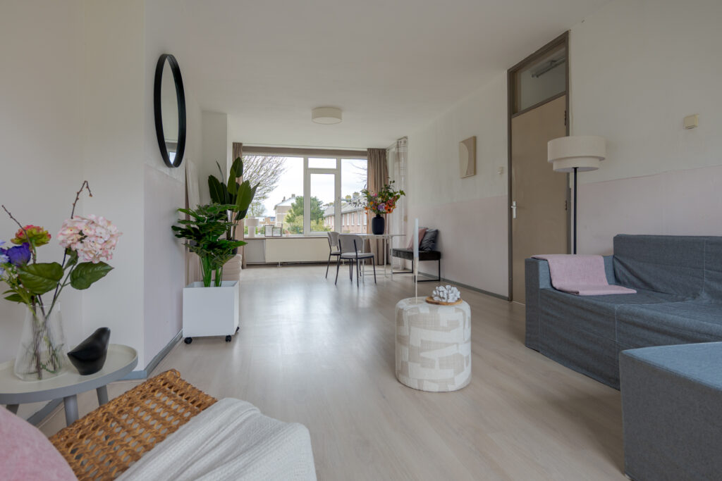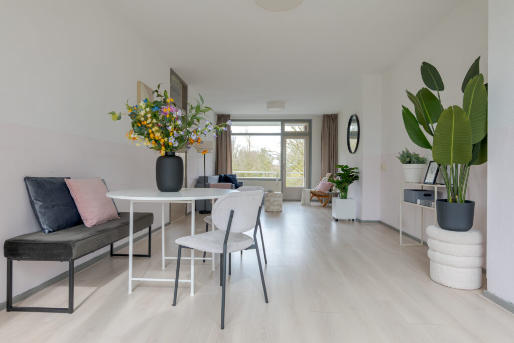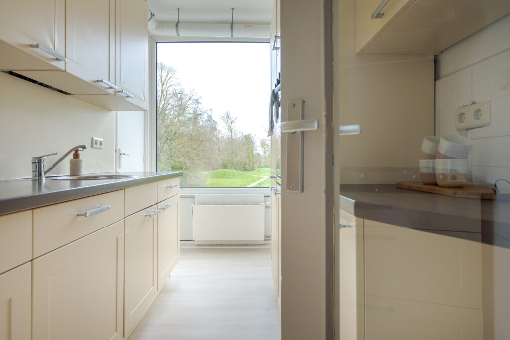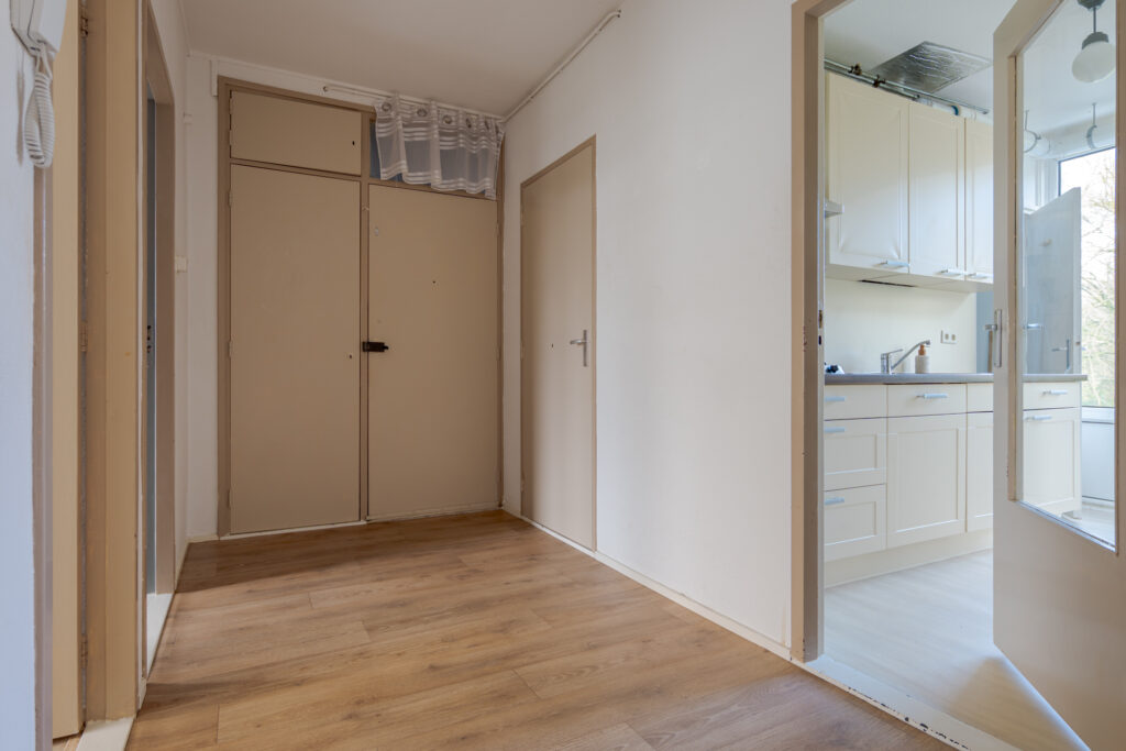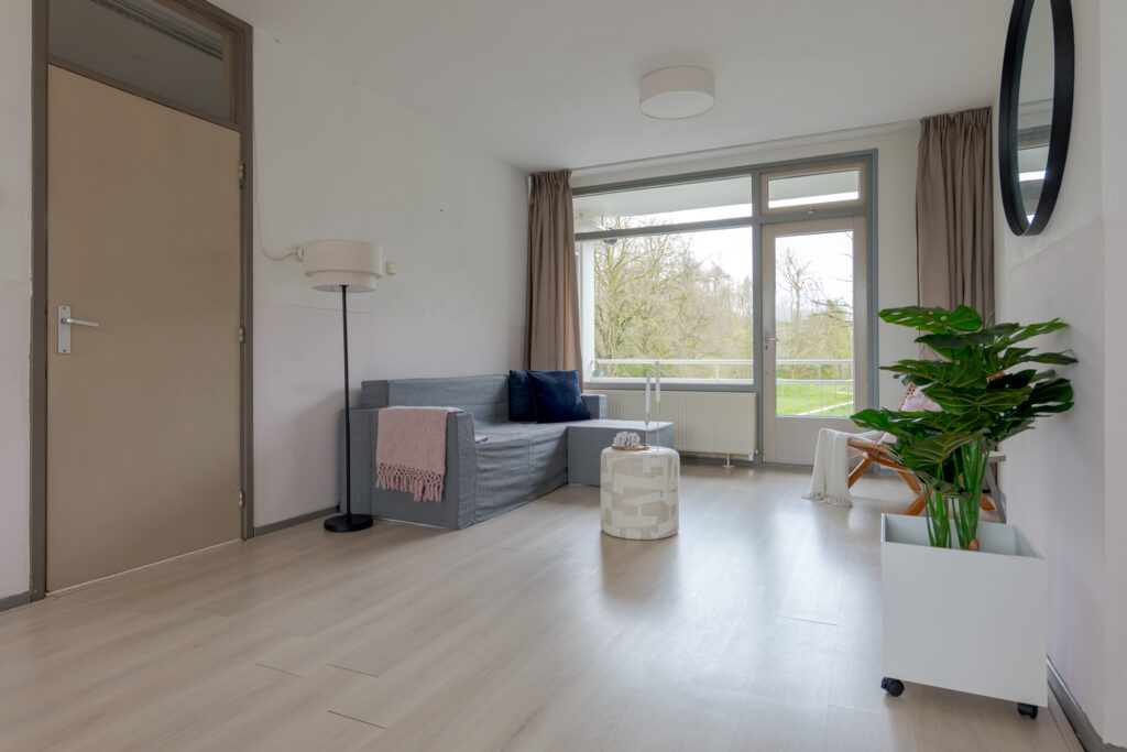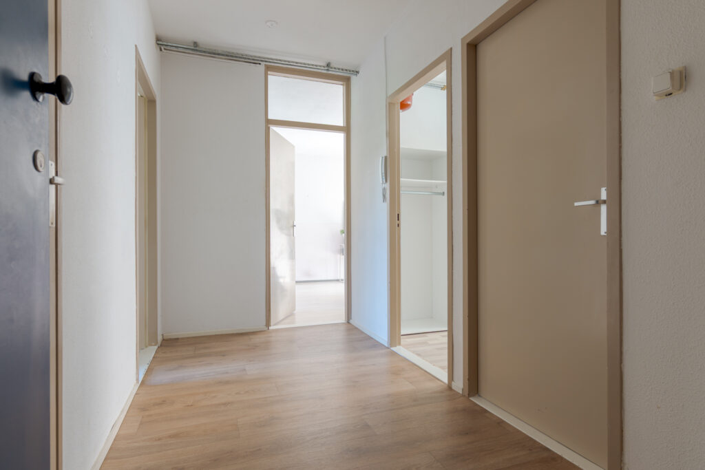 Via de entree bereikt u de hal, die toegang geeft tot het separate toilet, de keuken, twee slaapkamers en de royale woonkamer. Zodra u de woonkamer binnenstapt valt direct de prettige lichtinval op. De grote raampartijen en de deur naar het balkon zorgen voor een open sfeer en een mooi groen uitzicht. De lichte vloerafwerking en neutrale wandkleuren versterken het ruimtelijke karakter van deze leefruimte.