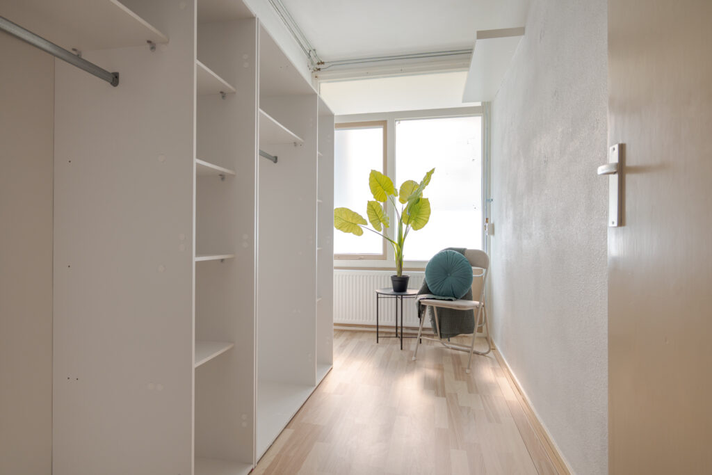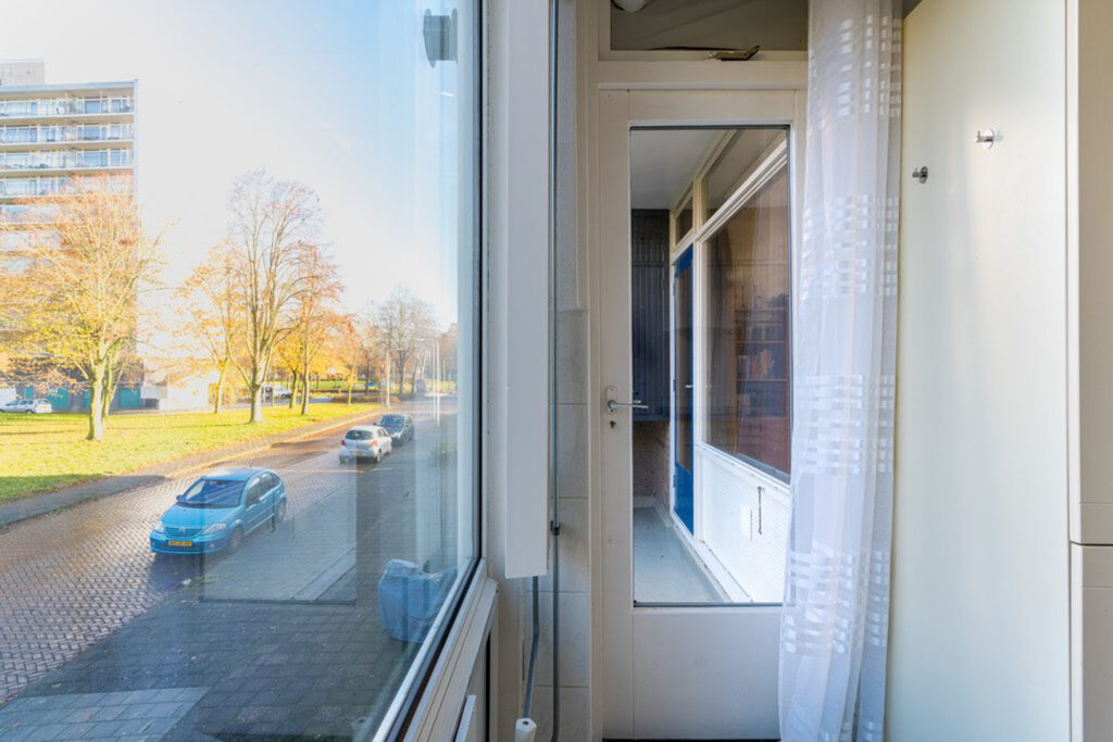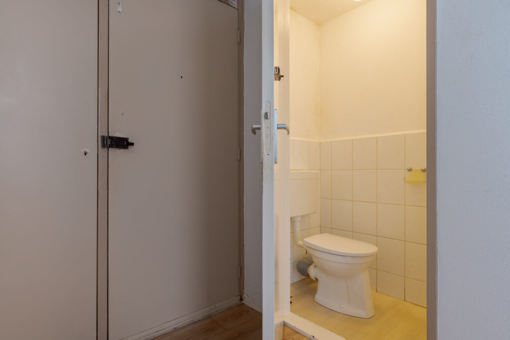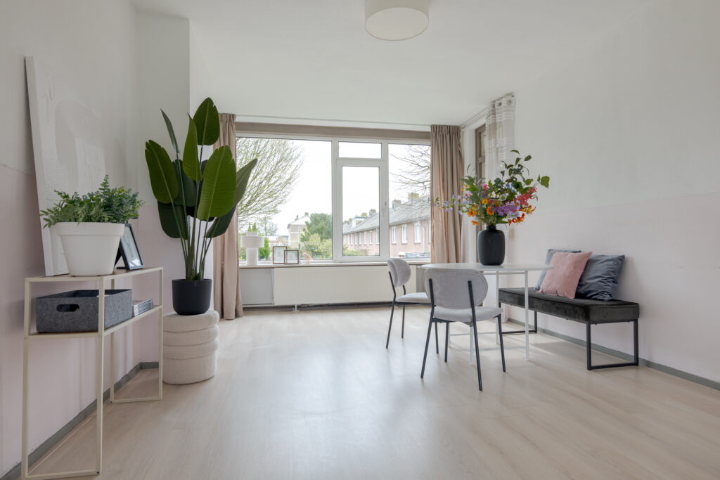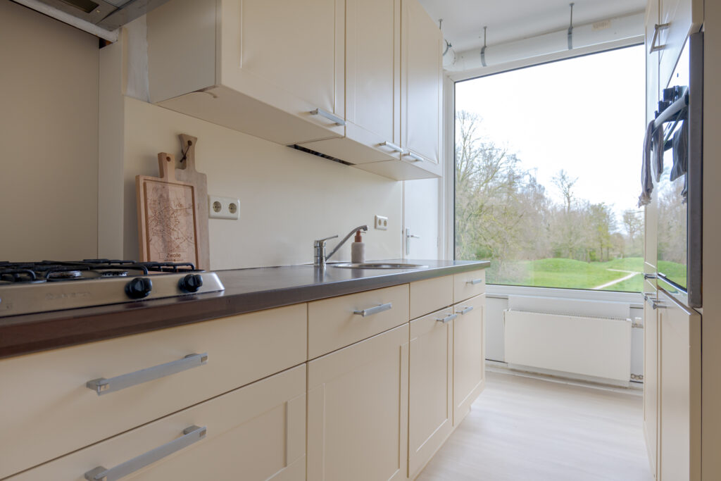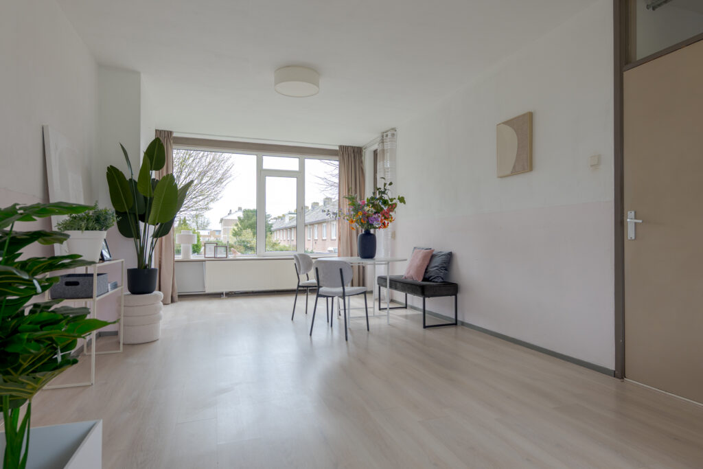 Via de entree bereikt u de hal, die toegang geeft tot het separate toilet, de keuken, twee slaapkamers en de royale woonkamer. Zodra u de woonkamer binnenstapt valt direct de prettige lichtinval op. De grote raampartijen en de deur naar het balkon zorgen voor een open sfeer en een mooi groen uitzicht. De lichte vloerafwerking en neutrale wandkleuren versterken het ruimtelijke karakter van deze leefruimte.