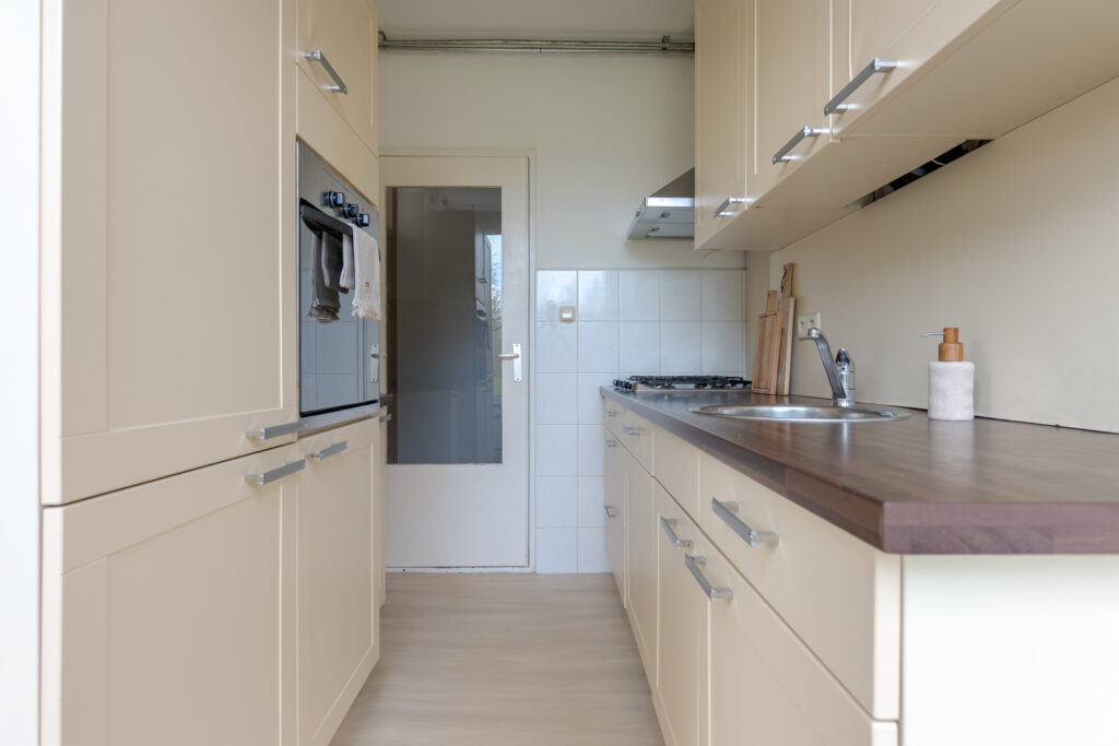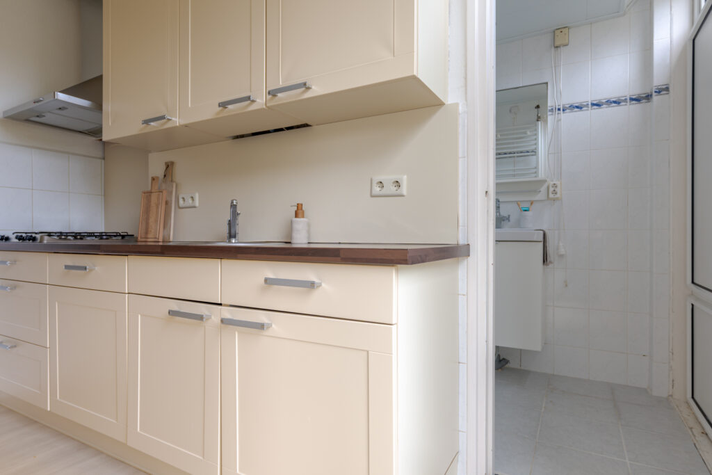 De keuken is vanuit de hal bereikbaar en uitgevoerd met lichte fronten, een donker werkblad en volop kastruimte. Ook hier valt aangenaam veel daglicht naar binnen en heeft u toegang tot een tweede balkon. Vanuit de keuken bereikt u de badkamer, die praktisch is ingedeeld en is voorzien van een inloopdouche met glazen wand en een wastafelmeubel, tevens bevindt zich hier de aansluiting voor de wasmachine.