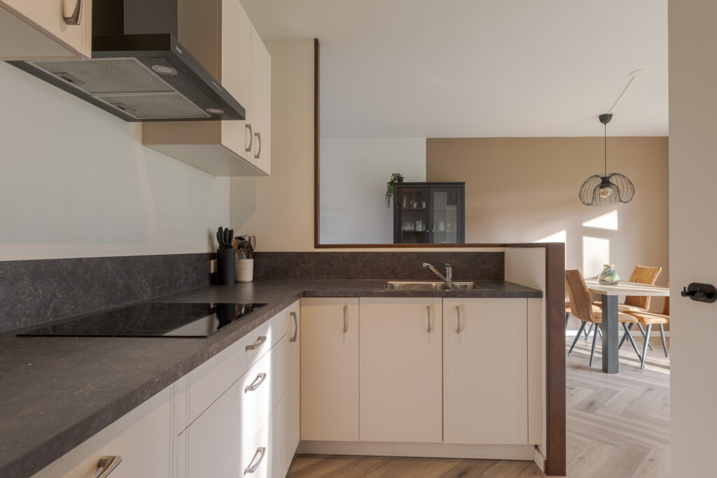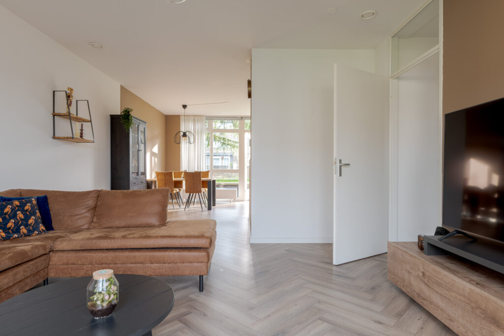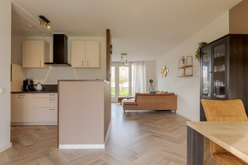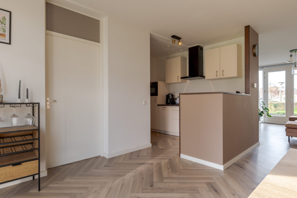 Wanneer u de woning binnenstapt, bereikt u via de hal de woonkamer. Deze is verrassend ruim en licht dankzij de grote raampartijen en openslaande deuren zowel aan de voorzijde als aan de achterzijde naar het brede terras. De visgraatvloer en neutrale wanden geven de ruimte een warme en rustige uitstraling. De keuken staat in open verbinding met de woonkamer en is uitgevoerd in lichte kastfronten met een donker werkblad. Hier bevindt zich een vaste kast.