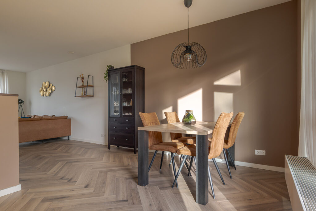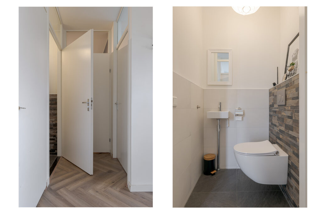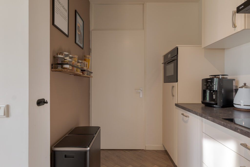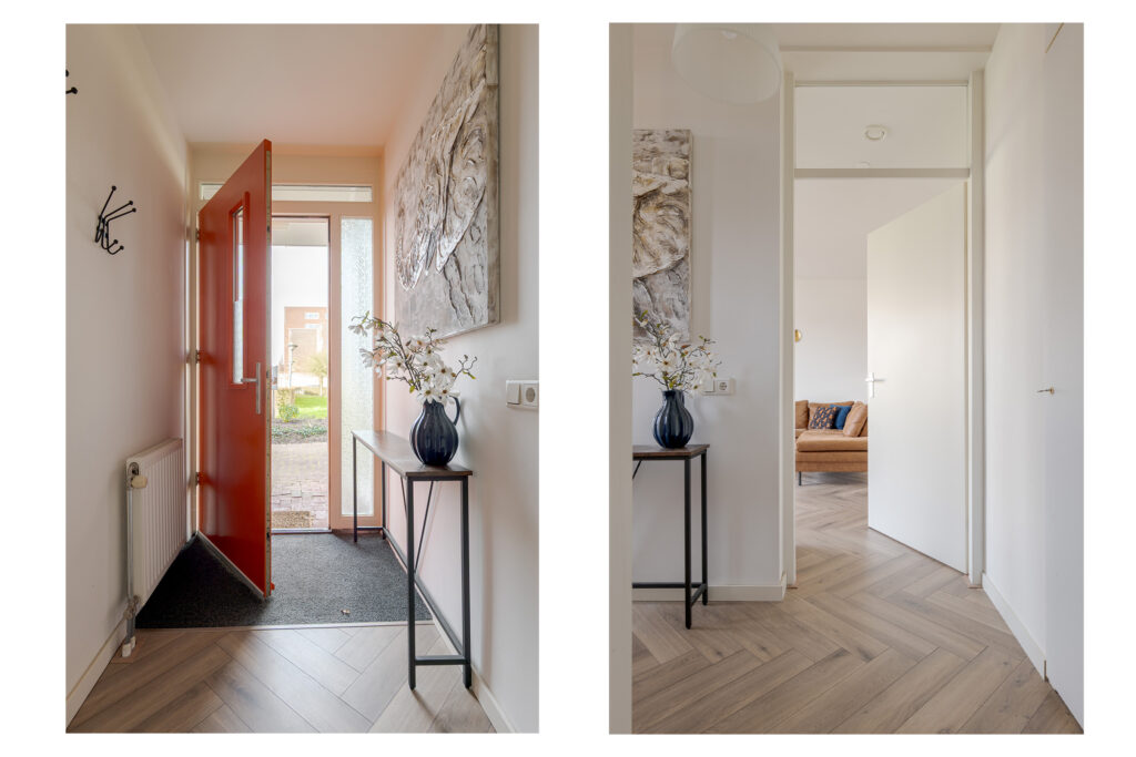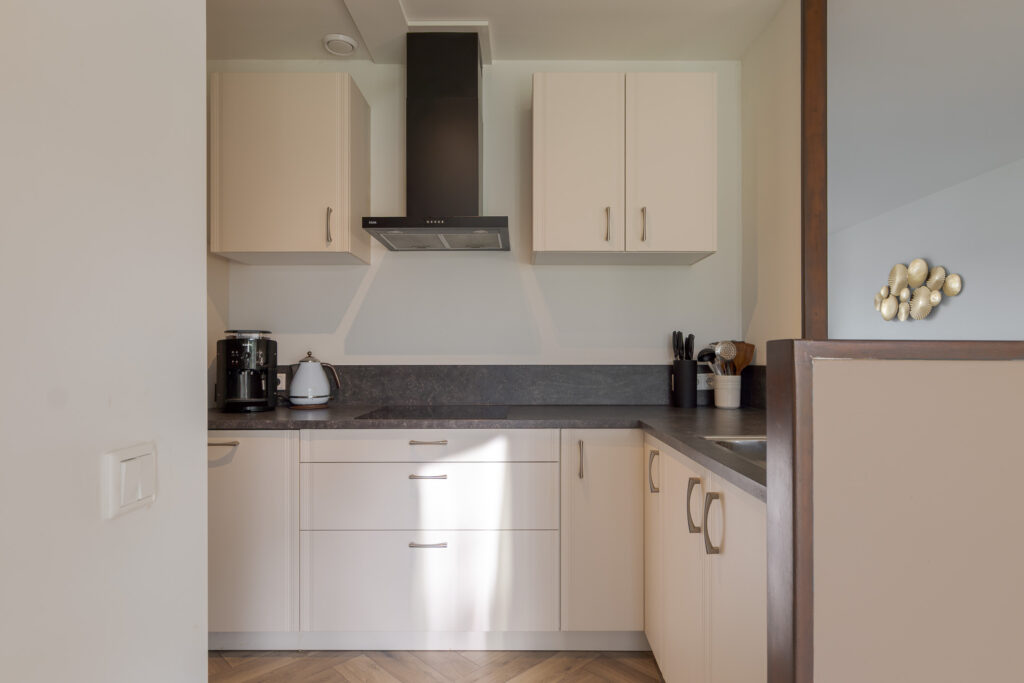 Wanneer u de woning binnenstapt, bereikt u via de hal de woonkamer. Deze is verrassend ruim en licht dankzij de grote raampartijen en openslaande deuren zowel aan de voorzijde als aan de achterzijde naar het brede terras. De visgraatvloer en neutrale wanden geven de ruimte een warme en rustige uitstraling. De keuken staat in open verbinding met de woonkamer en is uitgevoerd in lichte kastfronten met een donker werkblad. Hier bevindt zich een vaste kast.