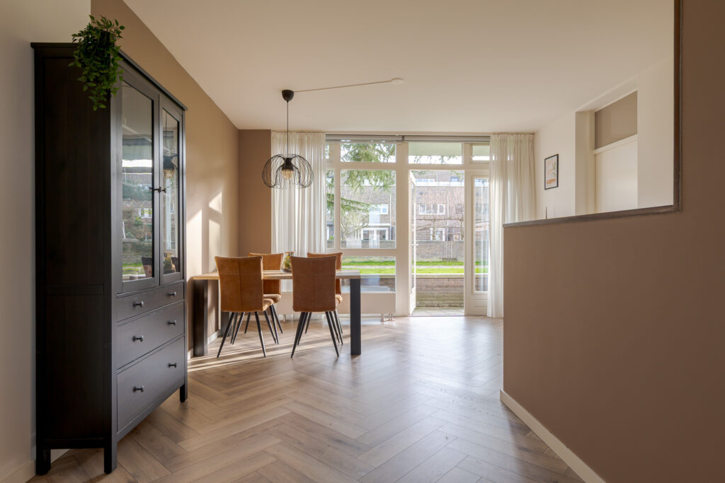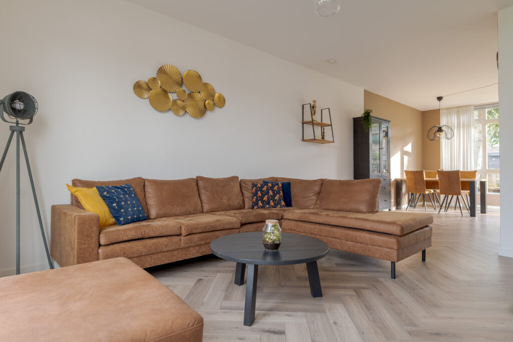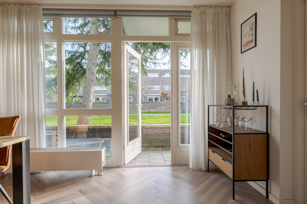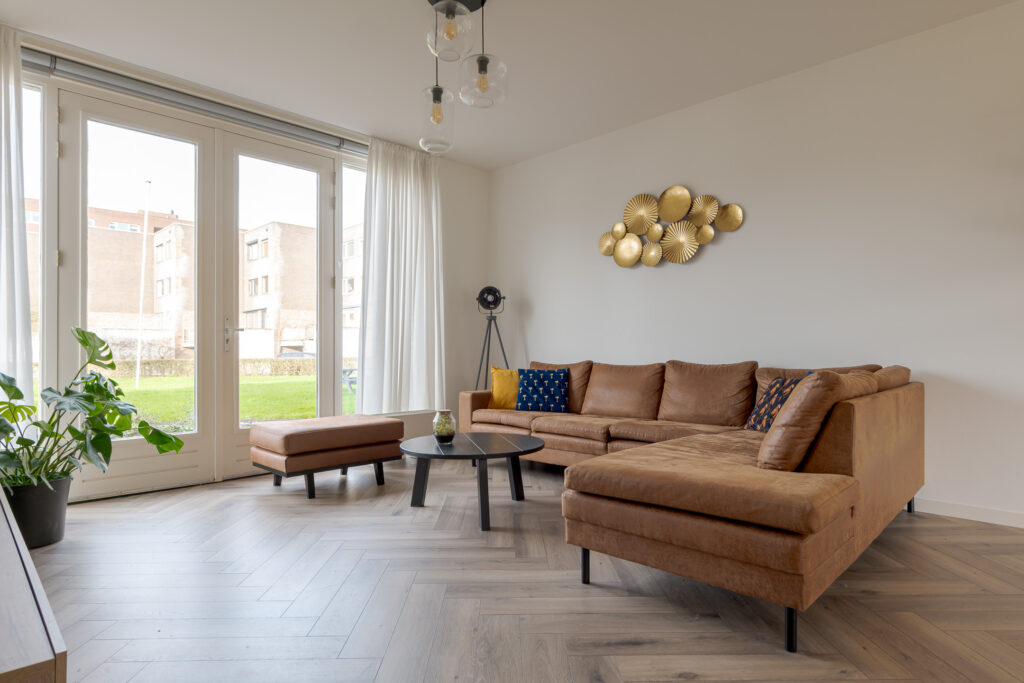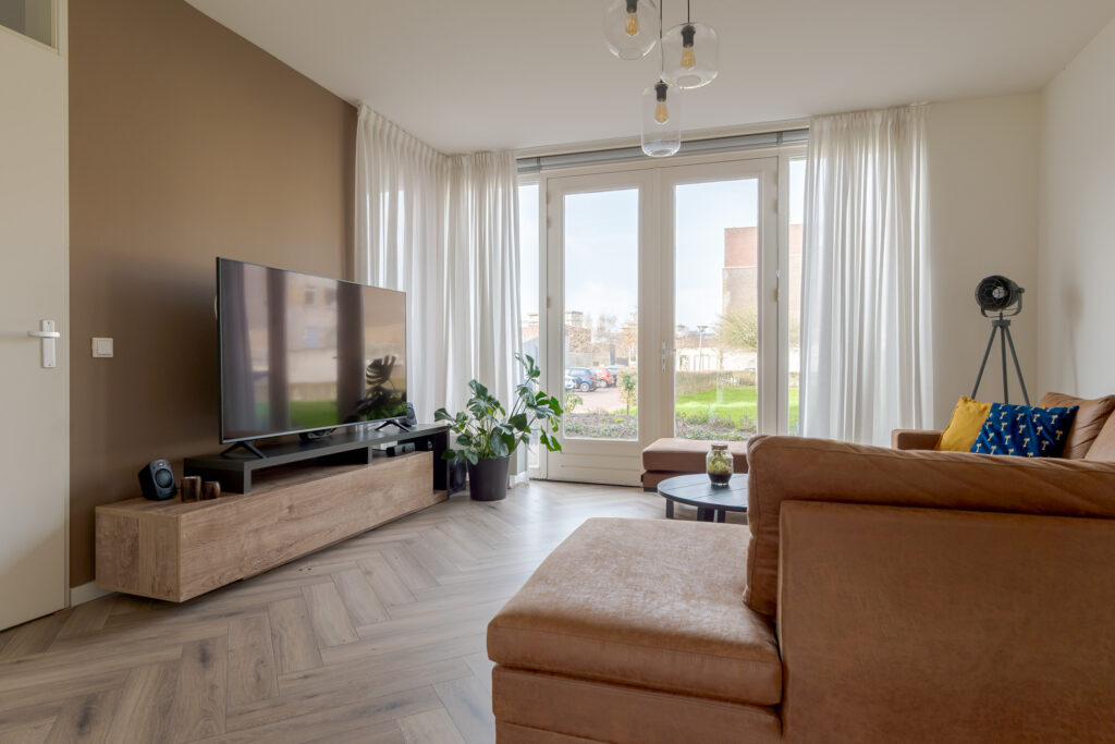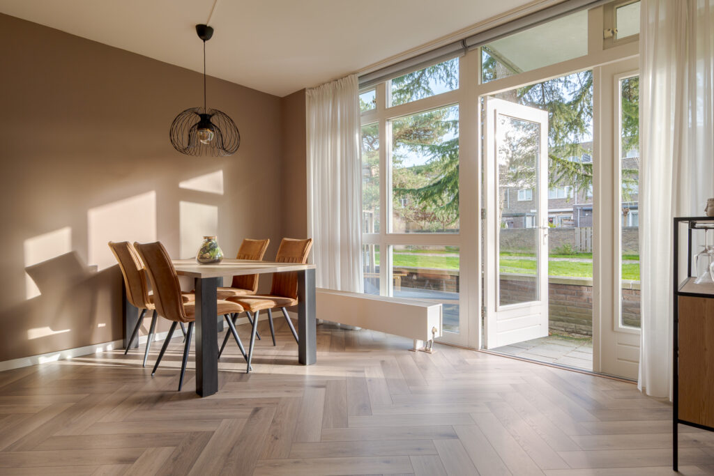– ruime en lichte woonkamer met openslaande deuren en visgraatvloer;