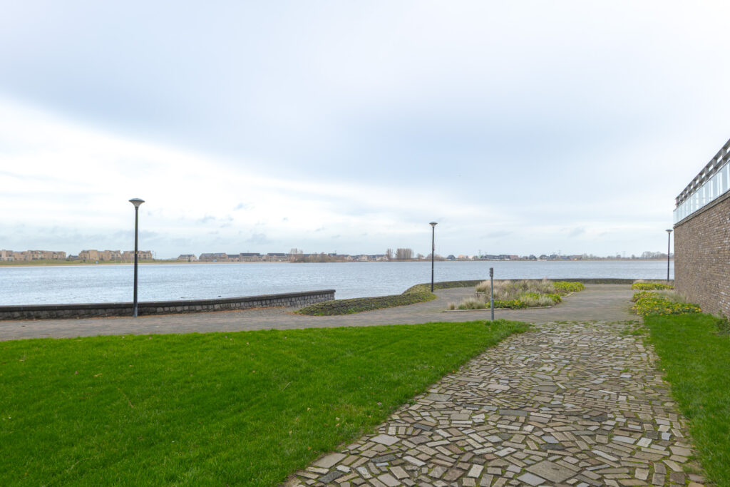 Het terras aan de achterzijde is een heerlijke plek om buiten te zitten, met vrij zicht op groen en water. Dankzij de openslaande deuren vormt het terras een natuurlijk verlengstuk van de woonkamer.
