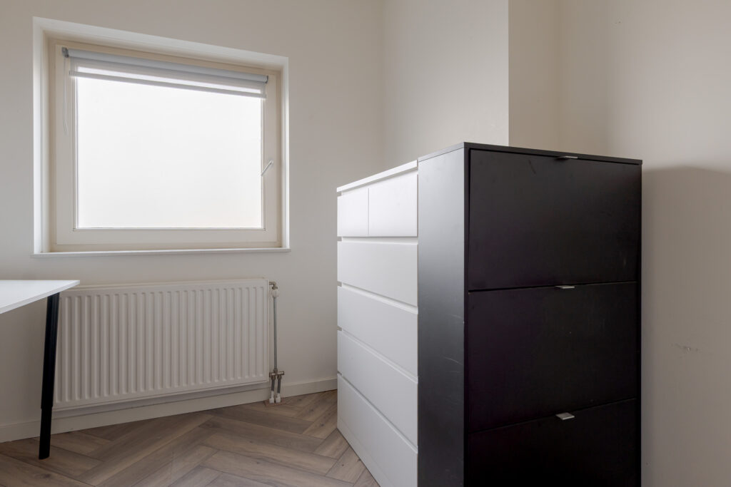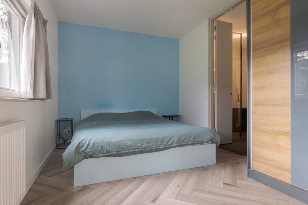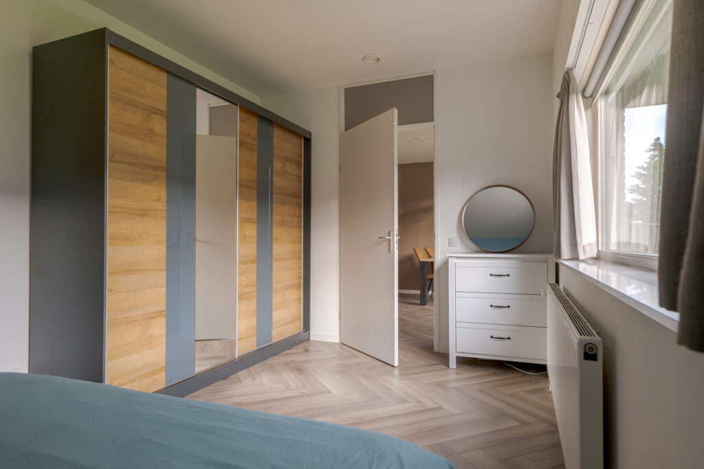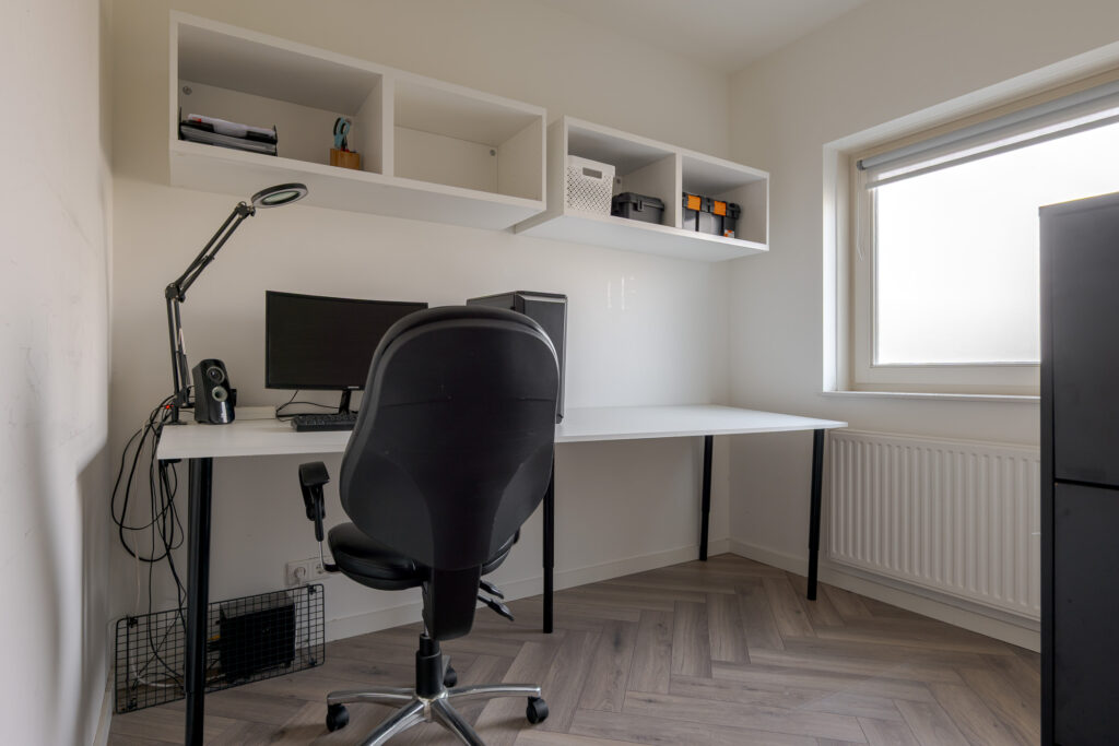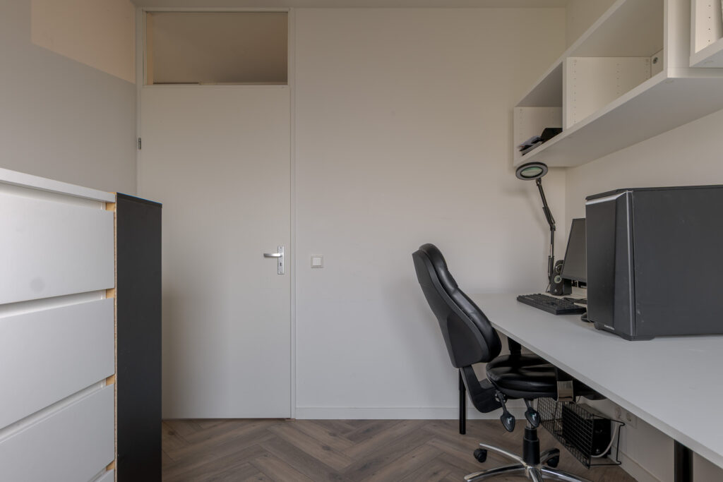 De hoofdslaapkamer ligt aan de terraszijde en beschikt over een groot raam met zicht op het groen. De tweede slaapkamer bevindt zich aan de voorzijde; deze ruimte wordt momenteel gebruikt als werk-/kantoorruimte en ontvangt prettig daglicht.