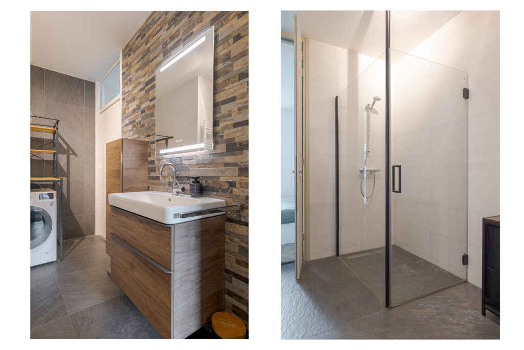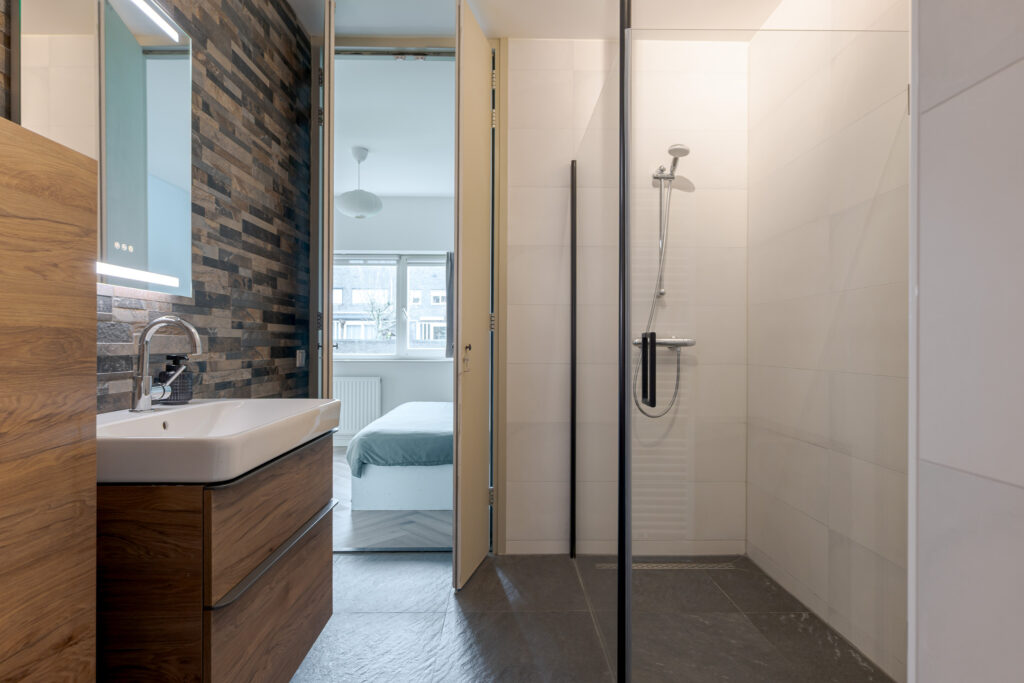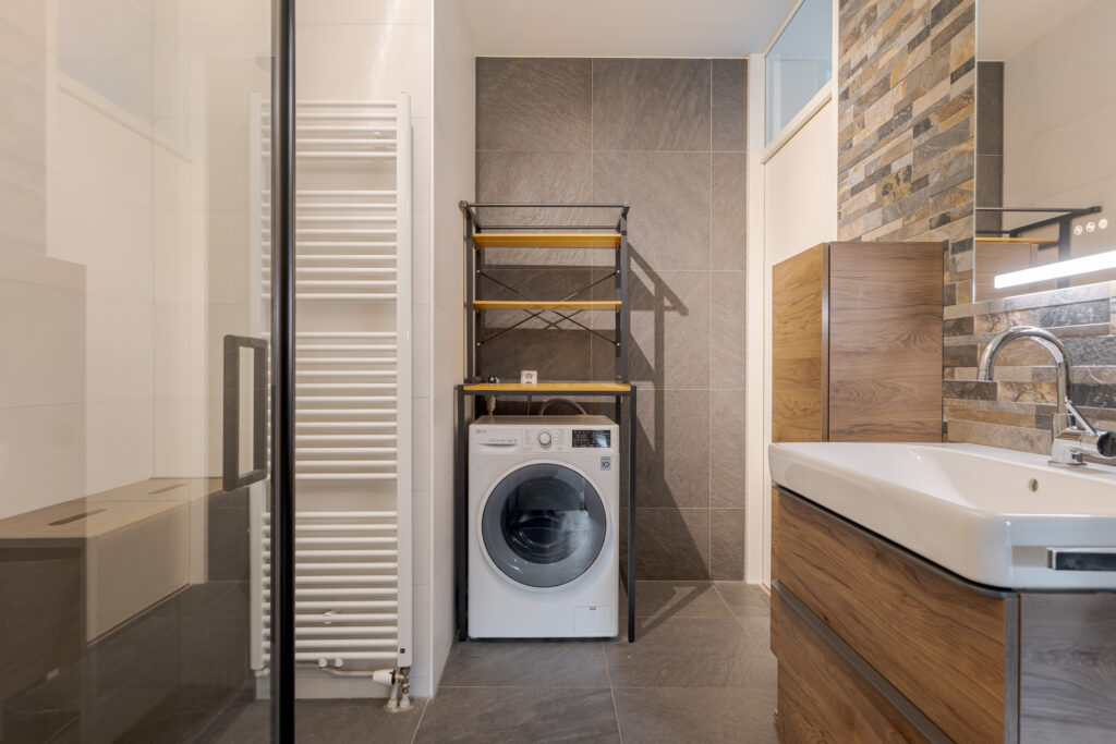 De badkamer is bereikbaar via de grote slaapkamer en is praktisch ingedeeld met een douche, wastafel met meubel en de wasmachineaansluiting. Er is gebruikgemaakt van sfeervolle aardse tinten en houtaccenten.
