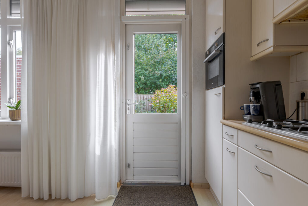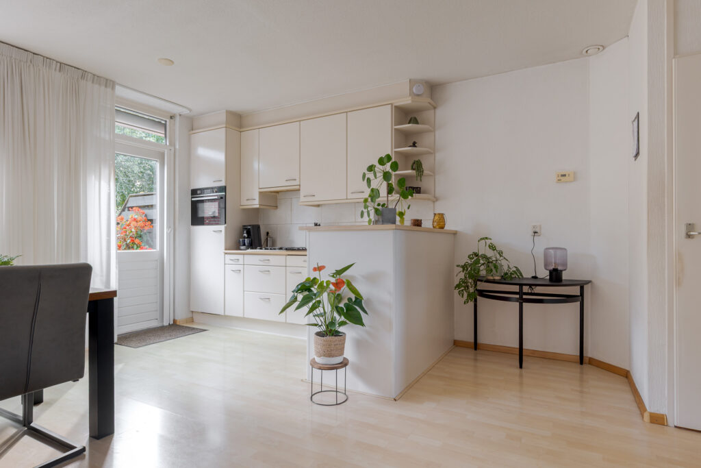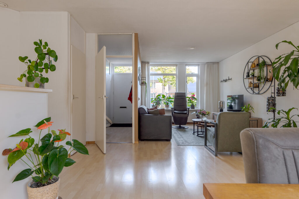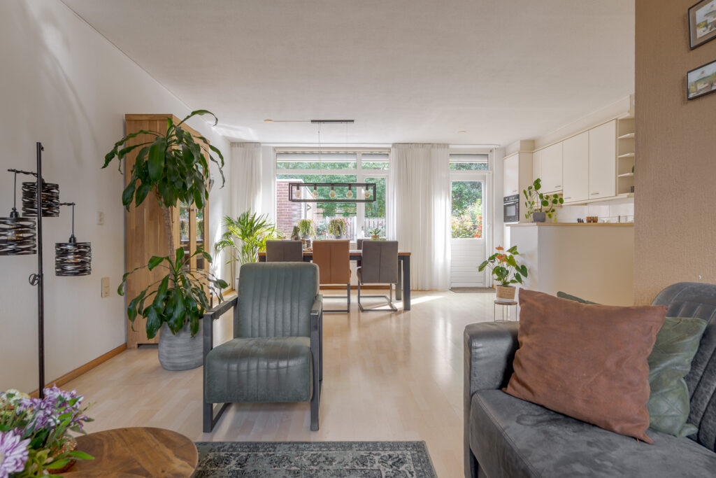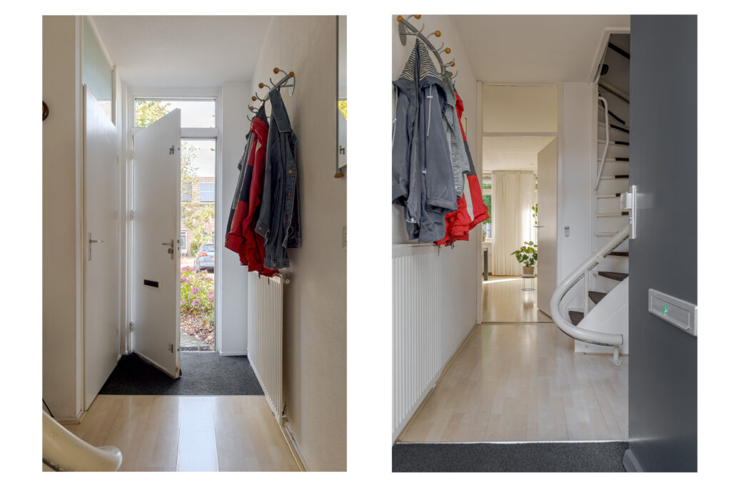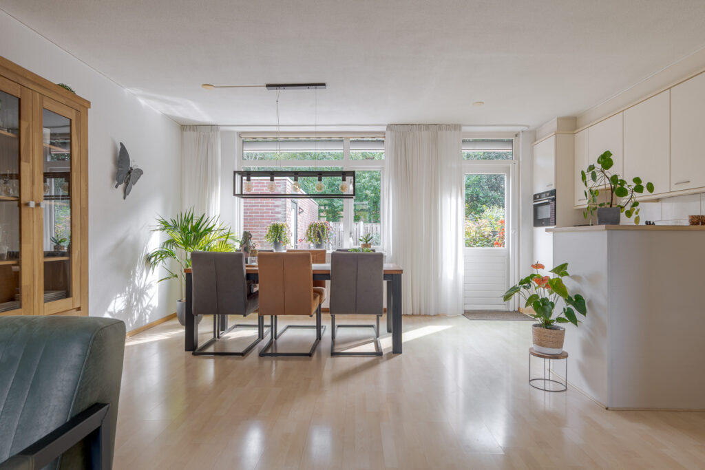 De woning heeft een verzorgd en klassiek gevelbeeld met een karakteristiek zadeldak en grote ramen aan de voorzijde. De voortuin geeft privacy en een prettige eerste indruk. Via de entree met meterkast, toilet en trapopgang (met traplift), betreedt u de ruime woonkamer, die zich uitstrekt over de volledige diepte van de woning. De grote raampartijen aan voor- en achterzijde zorgen voor een fijne lichtinval, waardoor de ruimte helder en uitnodigend aanvoelt. Aan de achterzijde bevindt zich de halfopen keuken in hoekopstelling, deze is voorzien van diverse inbouwapparatuur. Dankzij de opstelling is veel werk- en opbergruimte. Vanuit de keuken is er directe toegang tot de tuin.
