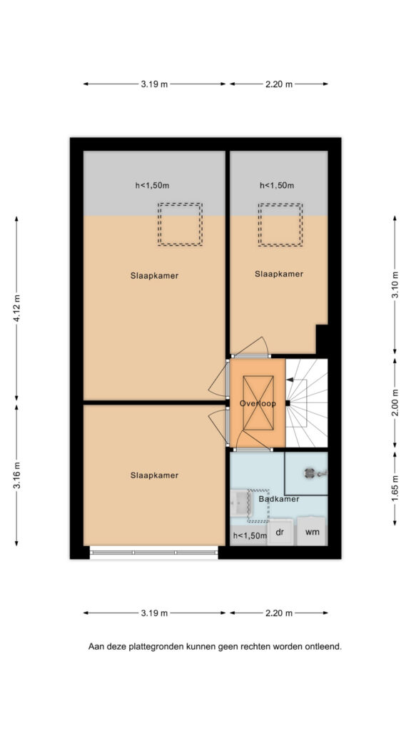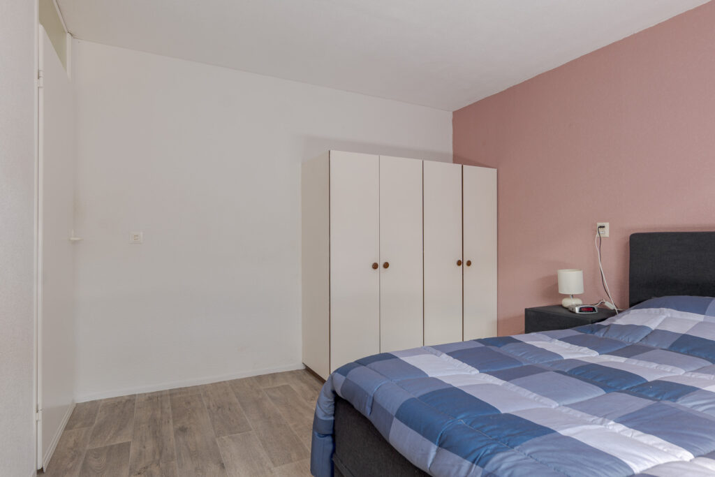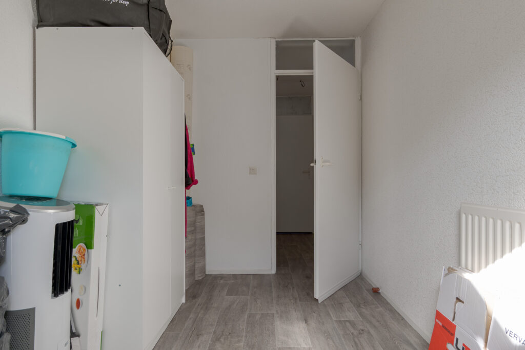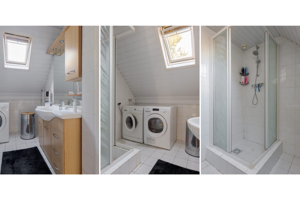 De eerste verdieping biedt drie slaapkamers, waaronder een royale hoofdslaapkamer aan de voorzijde en twee kamers aan de achterzijde. De badkamer is functioneel ingedeeld met een wastafelmeubel, douche, wasmachine-aansluiting en ruimte voor een droger.