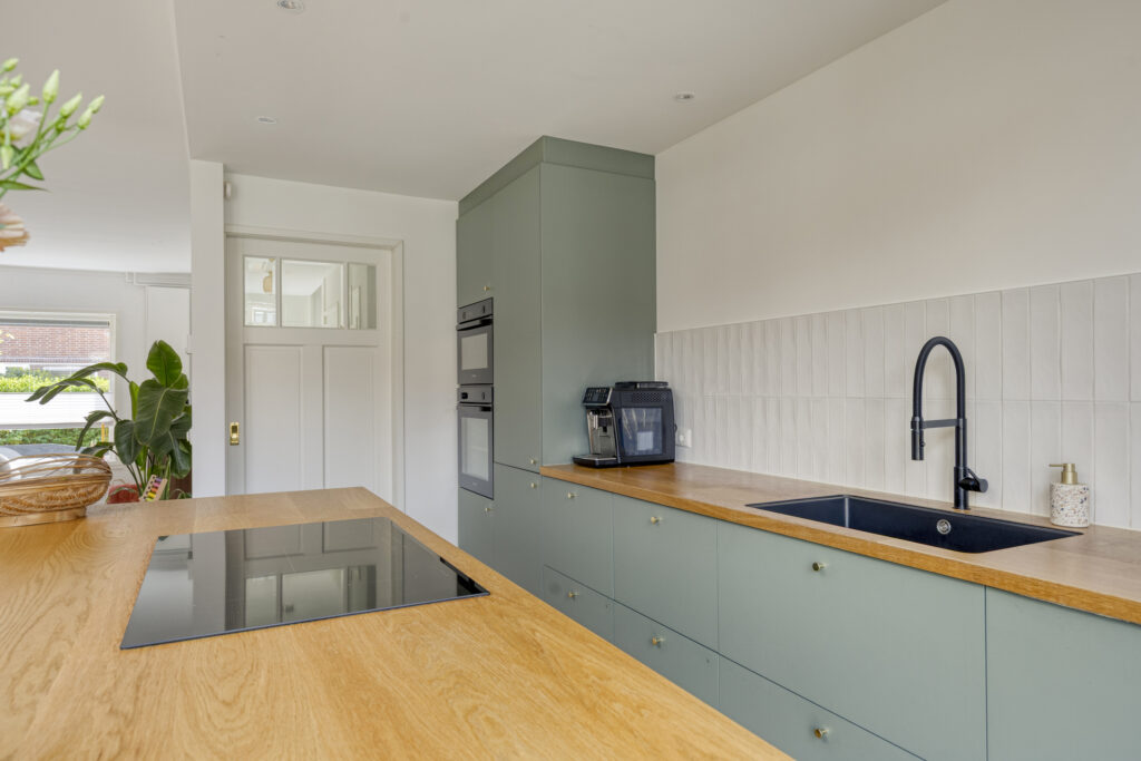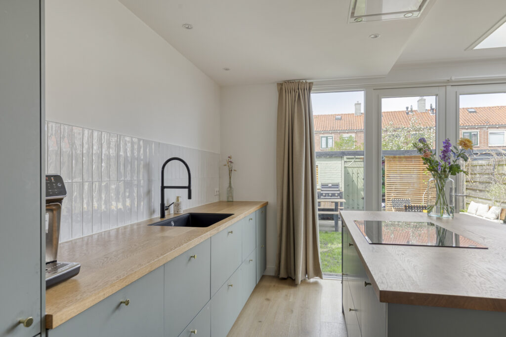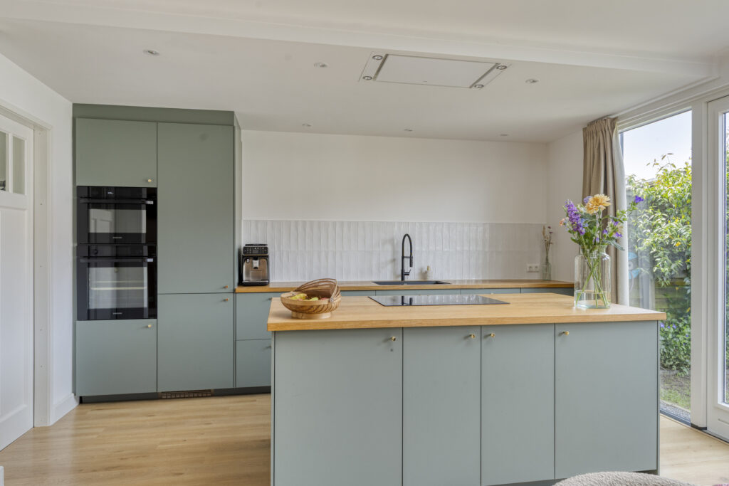 Aan de achterzijde bevindt zich de moderne open keuken (2023) met kookeiland. De keuken is strak vormgegeven en voorzien van diverse inbouwapparatuur, waaronder een inductiekookplaat, dual oven, magnetron, vaatwasser, koelkast en vrieslades. De vele lades en het eiland zorgen voor veel werk- en opbergruimte en maken dit een fijne plek om te koken en samen te komen.