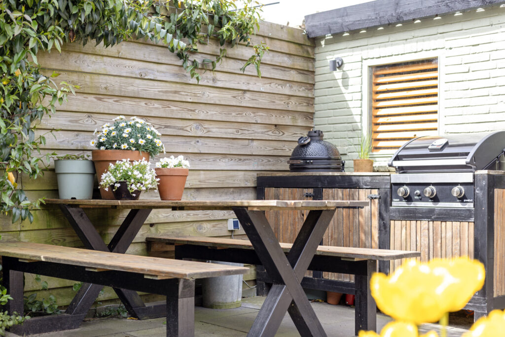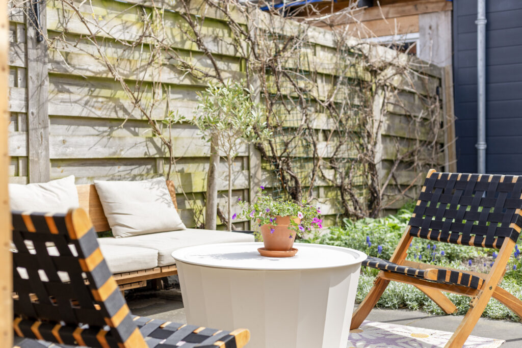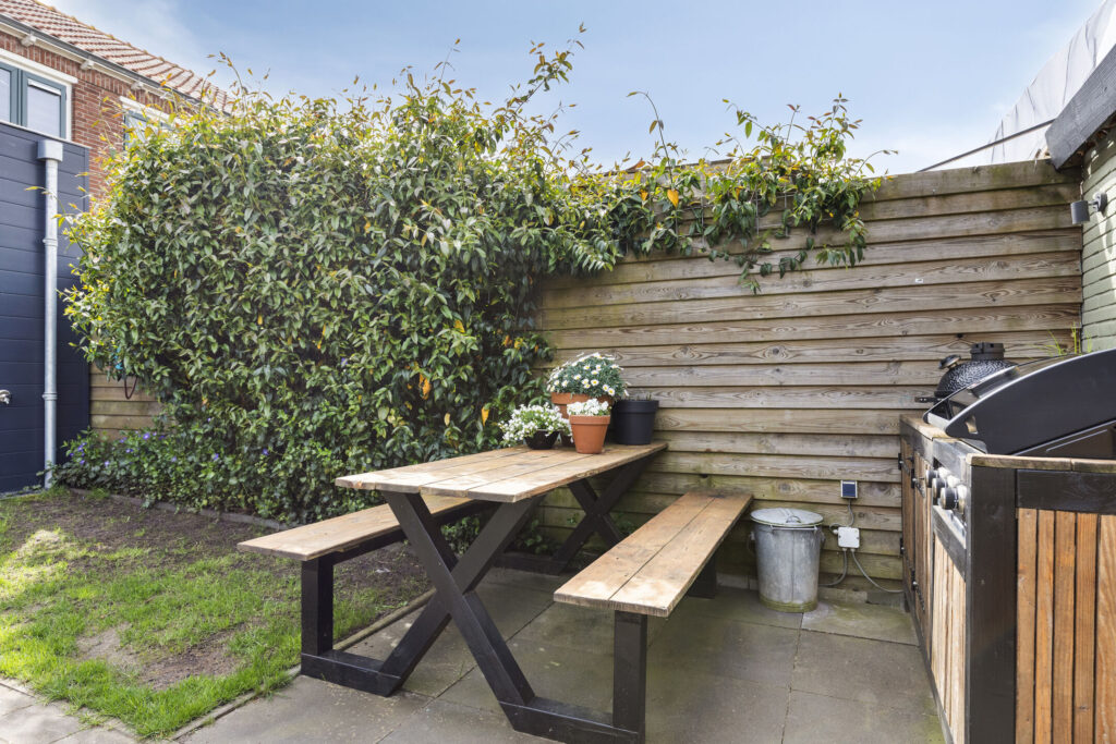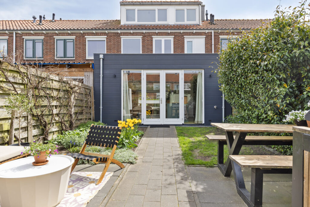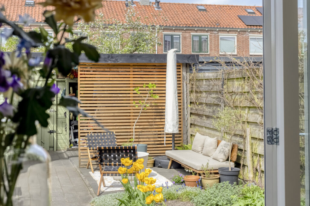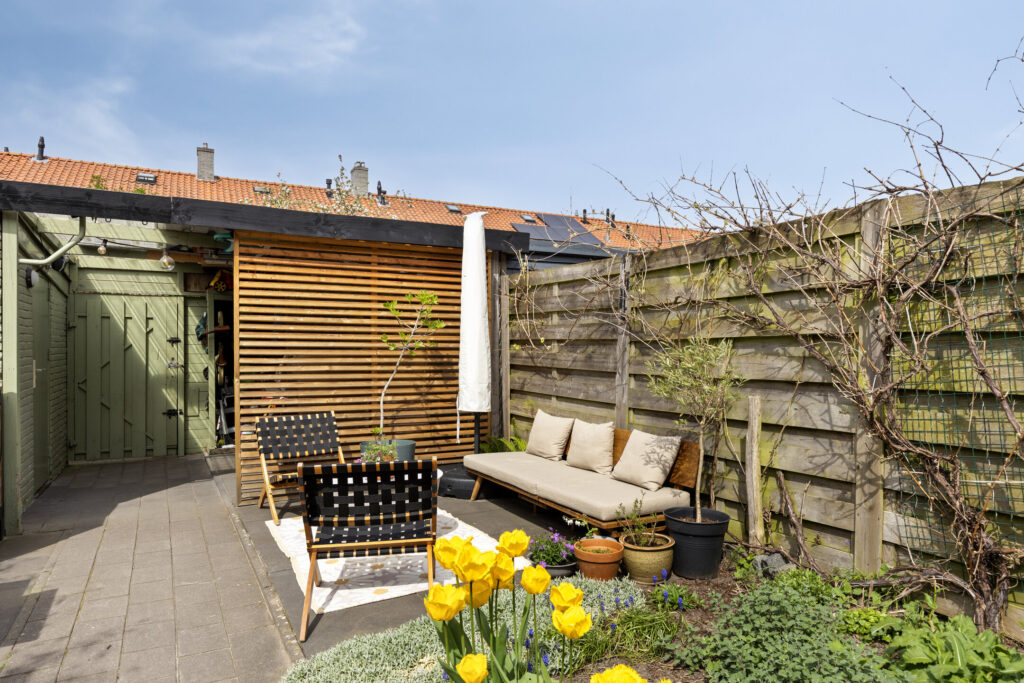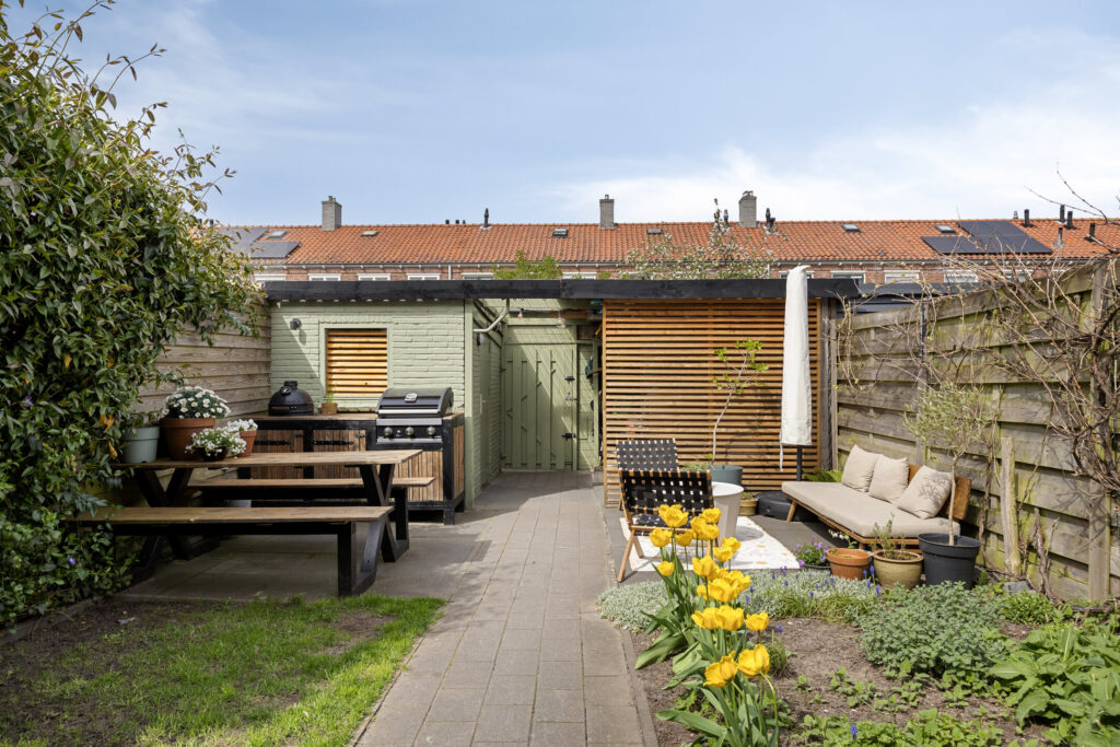 De zonnige achtertuin is verzorgd aangelegd en biedt een fijne buitenruimte met meerdere zitplekken. Achterin de tuin bevindt zich een vrijstaande berging en een overdekt gedeelte waar u heel praktisch de fietsen kan parkeren. Via de achterom is de tuin goed bereikbaar.