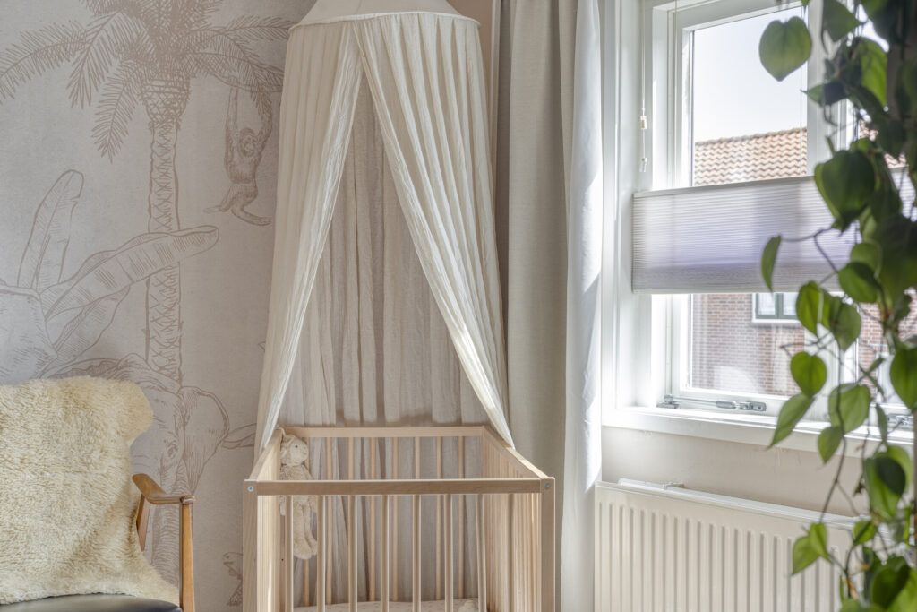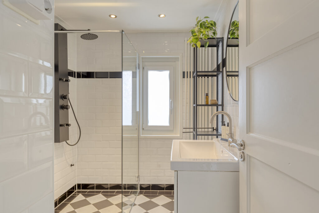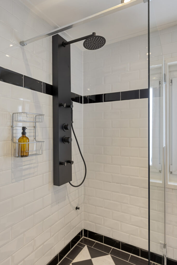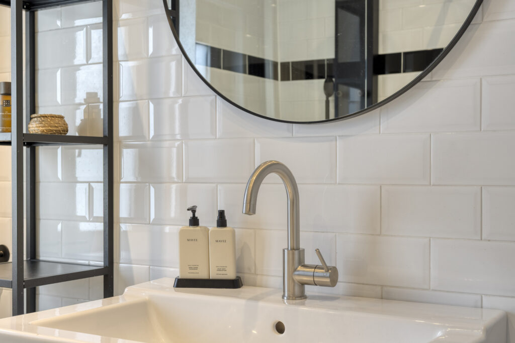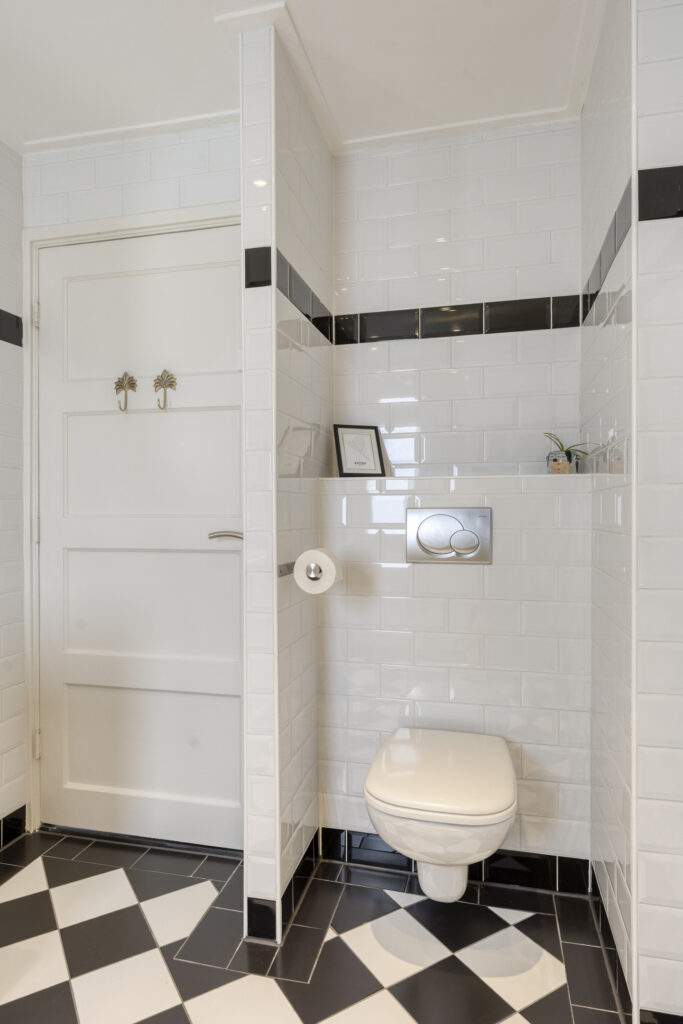 Op de eerste verdieping vindt u twee goed bemeten slaapkamers, beide voorzien van praktische vaste kasten. De badkamer is stijlvol afgewerkt met een moderne zwart-witte betegeling, wat zorgt voor een strak en tijdloos geheel. De ruimte beschikt over een inloopdouche, wastafelmeubel en toilet. Op de overloop is tevens een leuke én praktische kast met wasmachineaansluiting aanwezig.