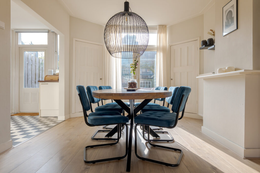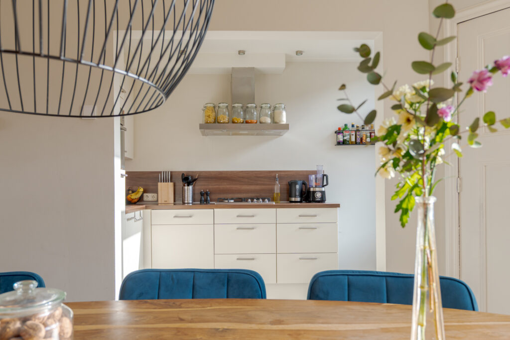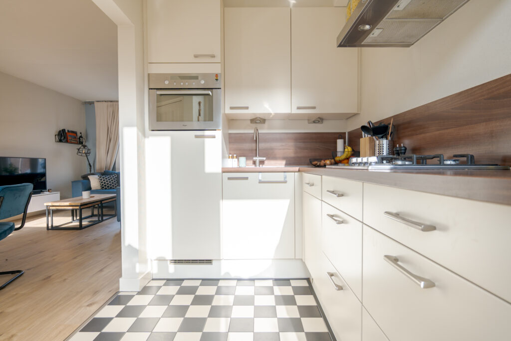 Aan de achterzijde van de woonkamer openen de openslaande deuren naar de tuin. Hierdoor ontstaat op zonnige dagen een mooie verbinding tussen binnen en buiten en loopt de leefruimte als het ware door naar buiten. De eethoek aan de achterzijde is een fijne plek om te ontspannen met zicht op de tuin. Aansluitend bevindt zich de keuken in neutrale kleuren met inbouwapparatuur en veel kast- en werkruimte. Deze ruimte is praktisch ingedeeld en biedt tevens uitzicht op de tuin, waardoor ook hier een prettige lichtinval aanwezig is. Vanuit de keuken is de tuin eveneens gemakkelijk bereikbaar.