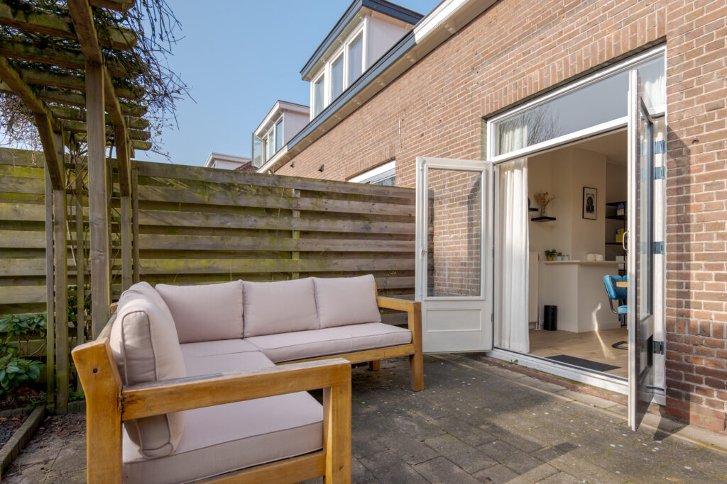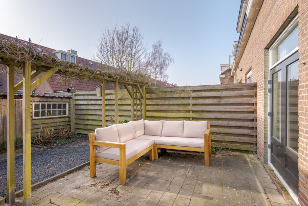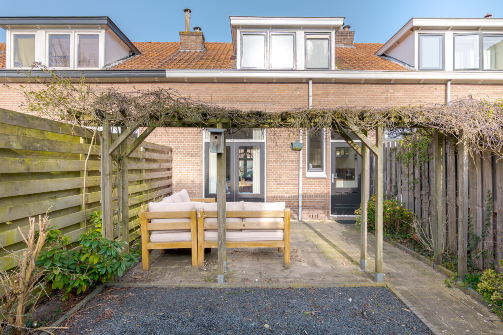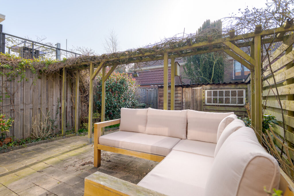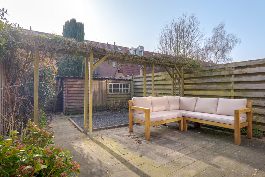 De achtertuin gelegen op het zuidoosten met ruim terras en pergola vormt een fijne buitenruimte waar u in alle rust van het buitenleven kunt genieten. Dankzij de openslaande deuren vanuit de woonkamer betrekt u de tuin eenvoudig bij de leefruimte, wat vooral in de warmere maanden zorgt voor een heerlijk verlengstuk van de woning. Achterin de tuin bevindt zich een achterom en een schuur. Ideaal voor de fietsen, gereedschap en tuinmeubilair.