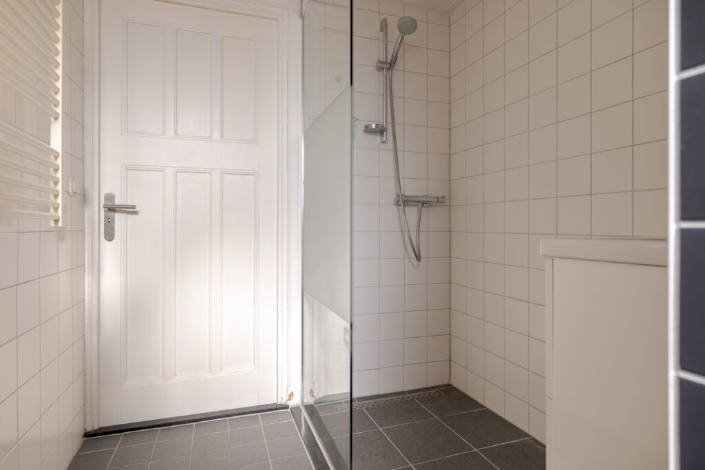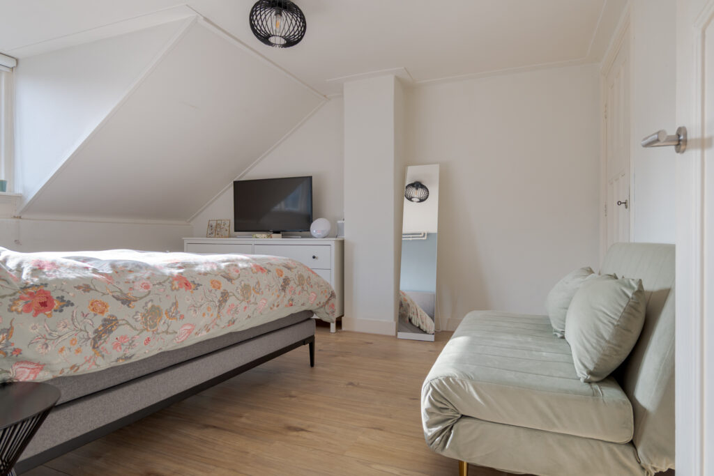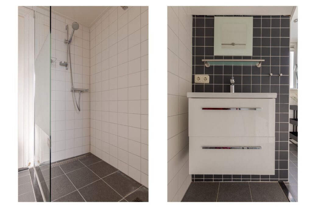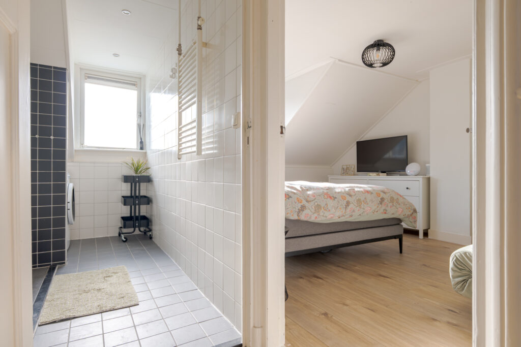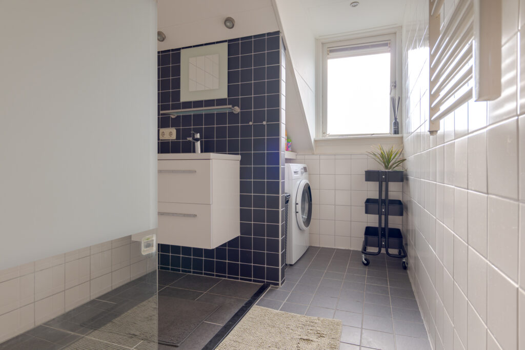 De nette badkamer is voorzien van een inloopdouche en wastafel met meubel. Tevens bevindt zich hier de aansluiting voor de wasmachine. Op de verdieping is daarnaast extra bergruimte aanwezig achter de knieschotten en in verschillende vaste kasten, waardoor de beschikbare ruimte efficiënt wordt benut.