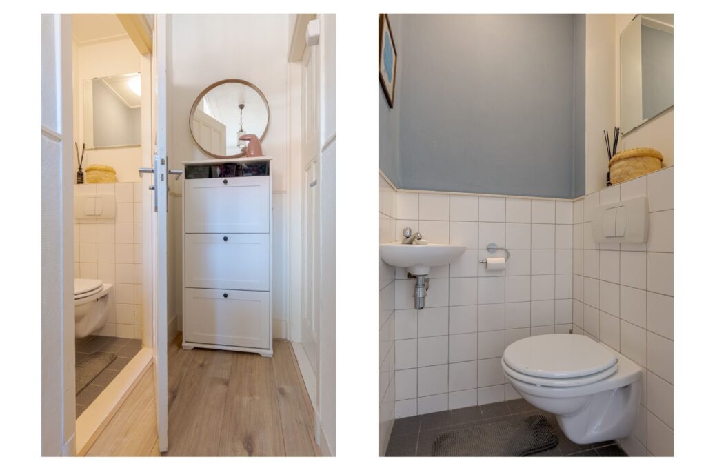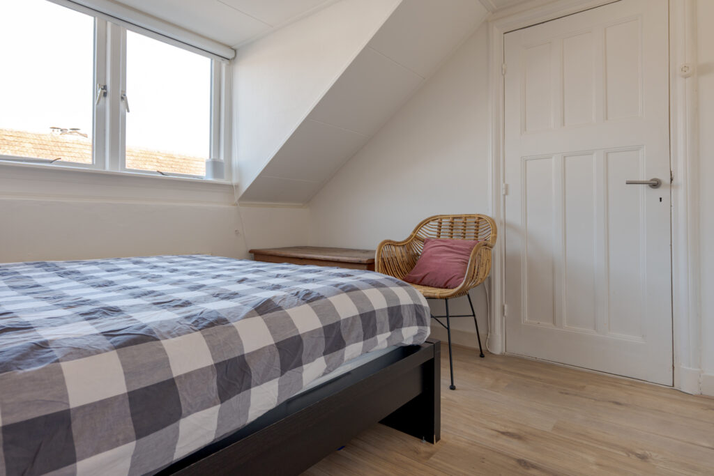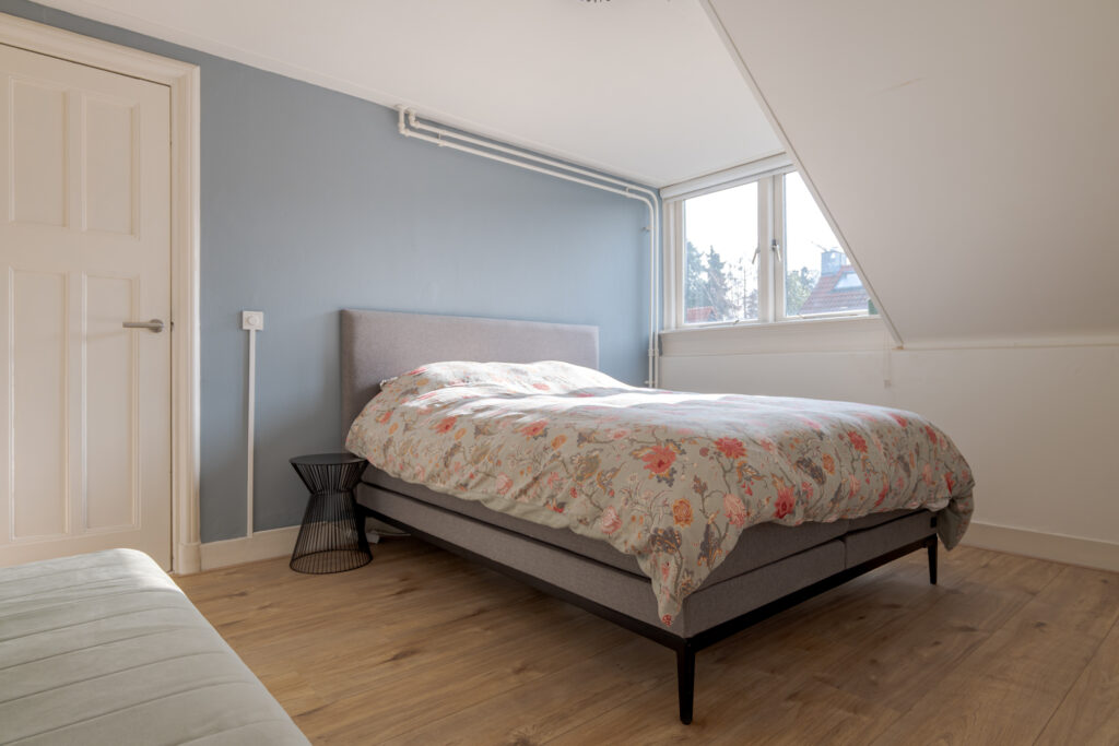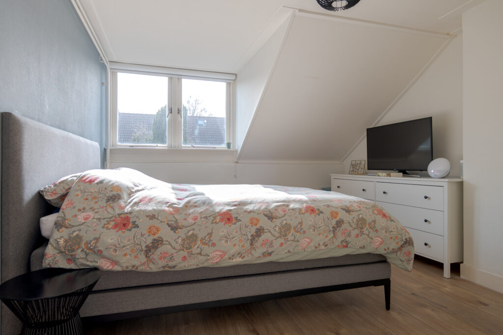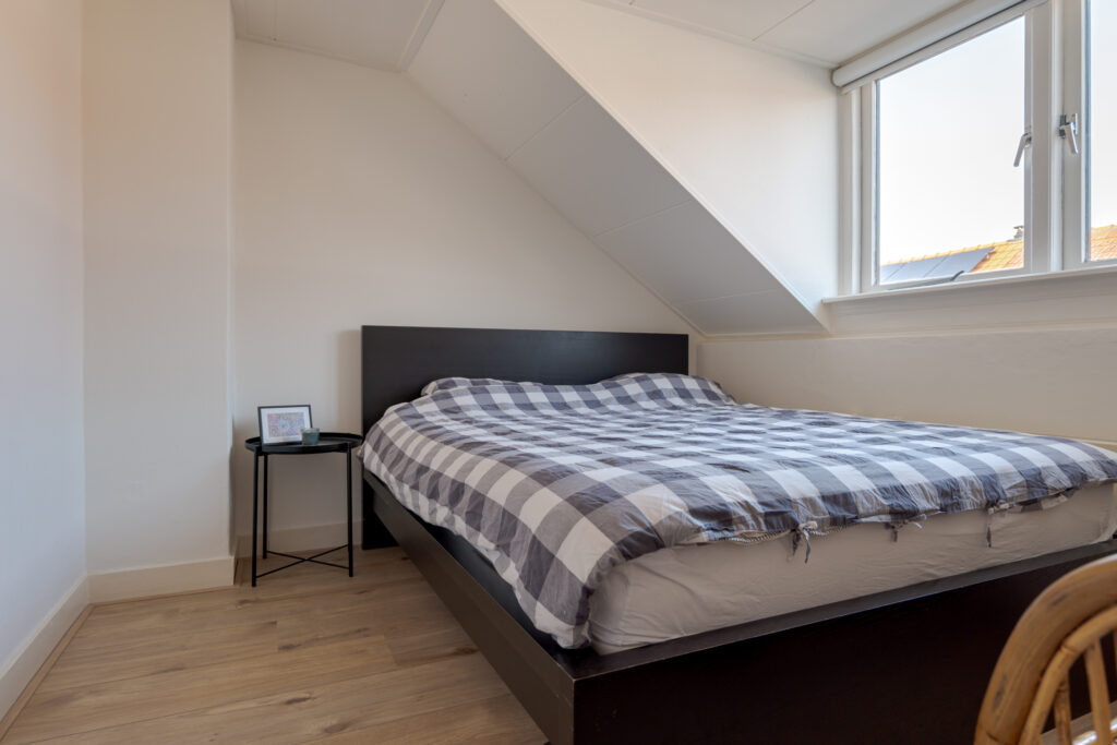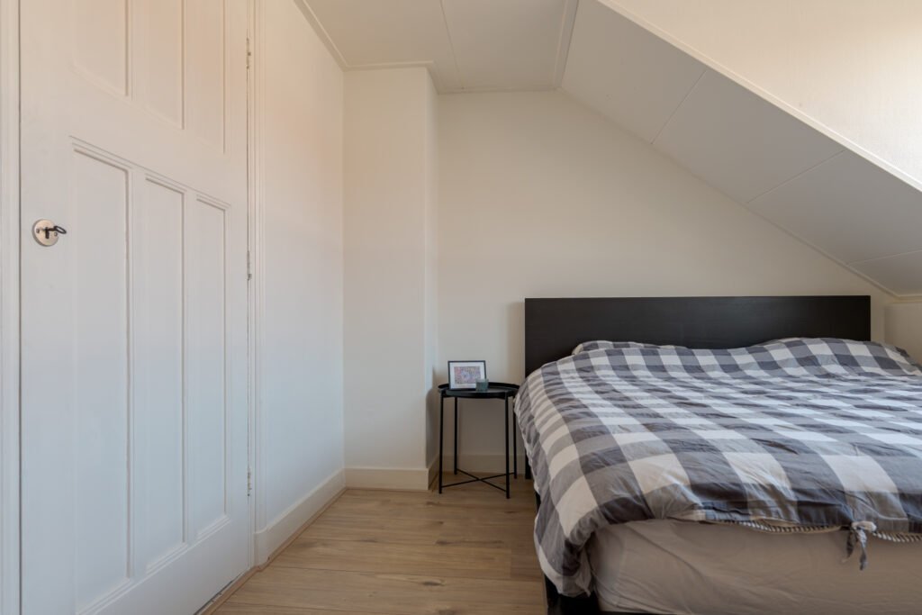 De nette badkamer is voorzien van een inloopdouche en wastafel met meubel. Tevens bevindt zich hier de aansluiting voor de wasmachine. Op de verdieping is daarnaast extra bergruimte aanwezig achter de knieschotten en in verschillende vaste kasten, waardoor de beschikbare ruimte efficiënt wordt benut.