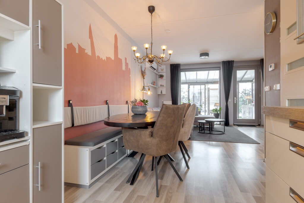 De woning zelf straalt warmte en comfort uit. Via de netjes aangelegde voortuin komt u binnen in de hal met toilet, meterkast en trapopgang. De lichte woonkamer aan de tuinzijde biedt een fijne leefruimte met toegang tot een sfeervolle serre: een heerlijke plek om te ontspannen of te genieten van de middagzon. De open keuken aan de voorzijde kijkt uit over de straat en profiteert van het vrije uitzicht. Deze sluit naadloos aan op het leefgedeelte. Op de begane grond bevindt zich tevens een vaste kast, handig voor extra opbergruimte.