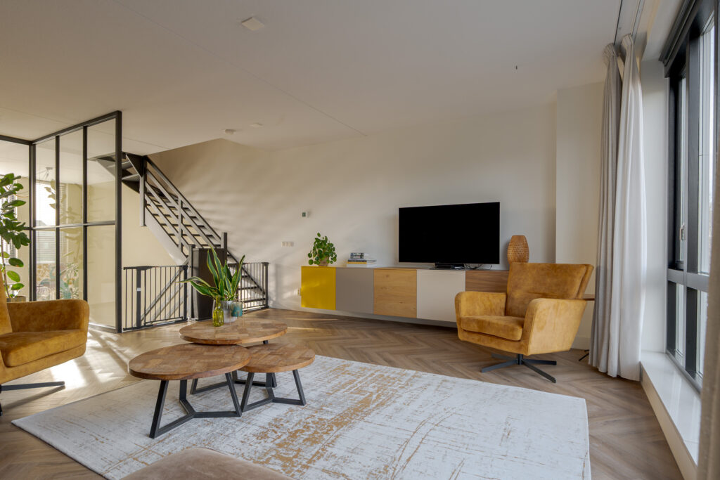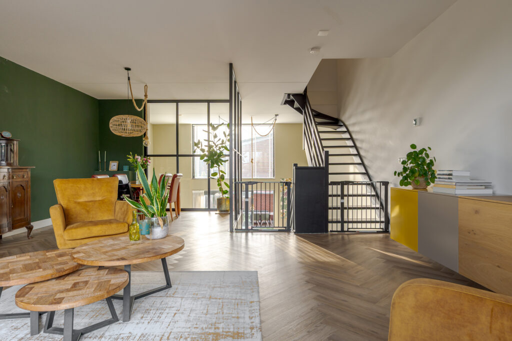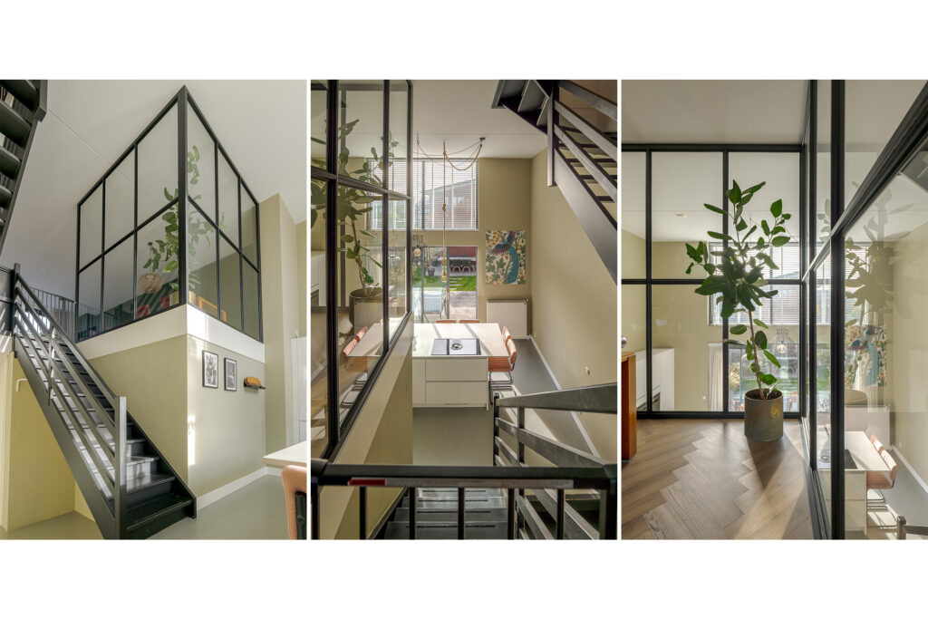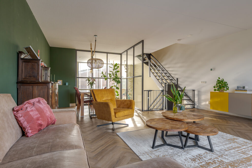 Op de eerste verdieping, bereikbaar middels trap in de keuken, bevindt zich de woonkamer. Door de open blik op de vide is dit een lichte en royale leefruimte. De glaswanden, zwarte details en het speelse lijnenspel van de trap geven het geheel een moderne, industriële uitstraling.
