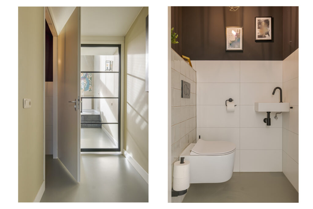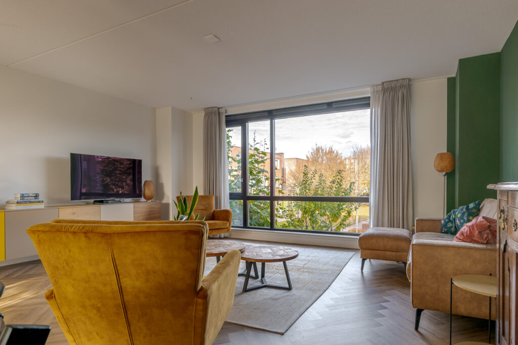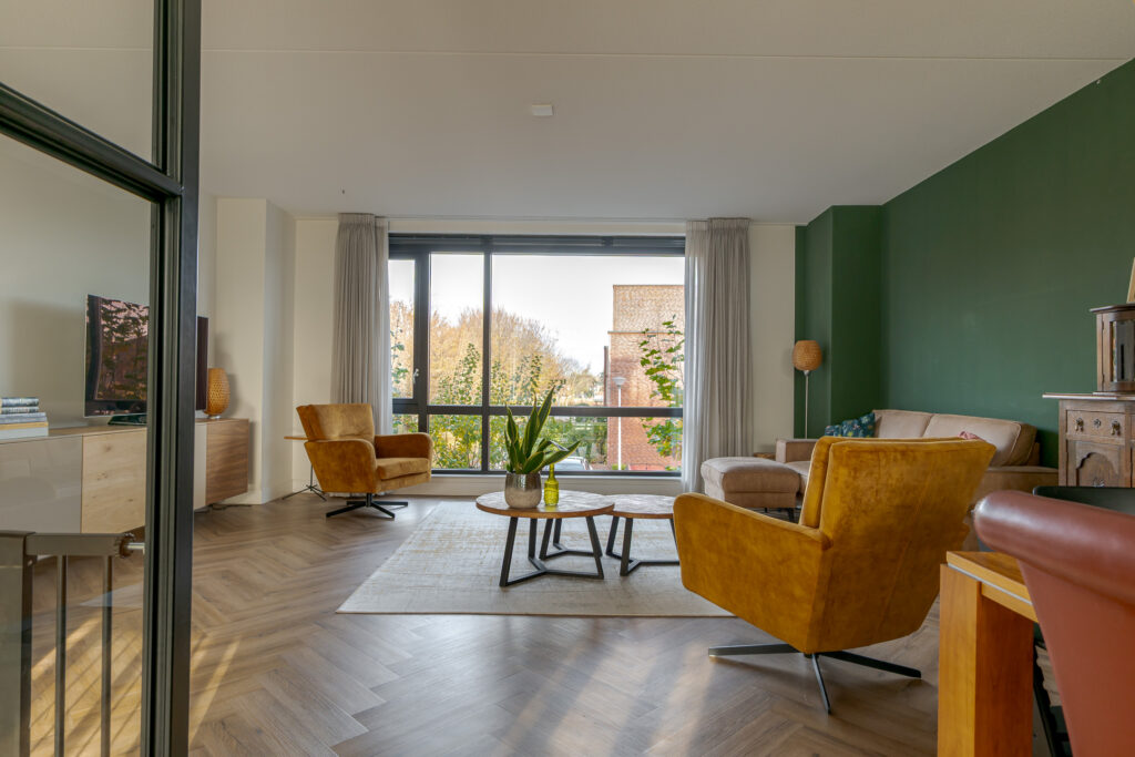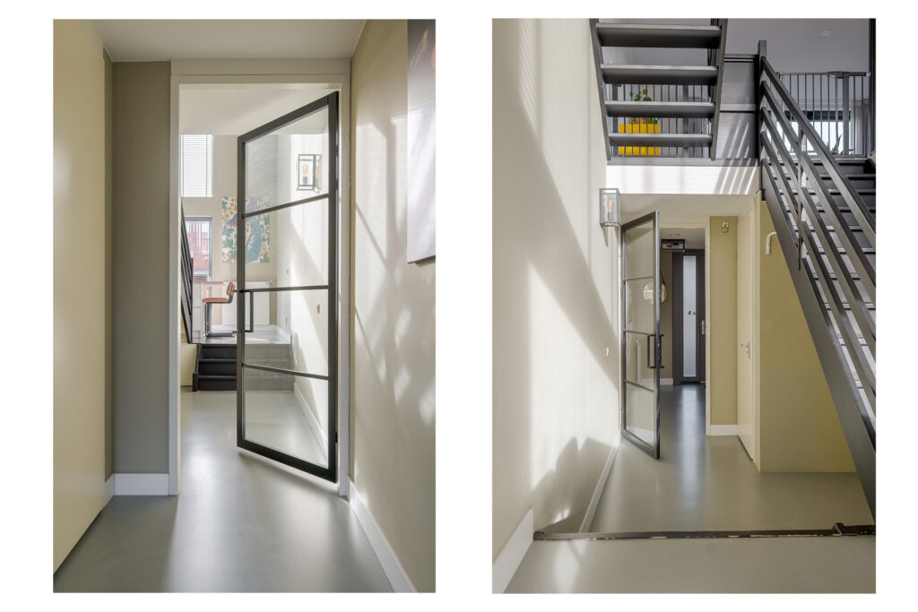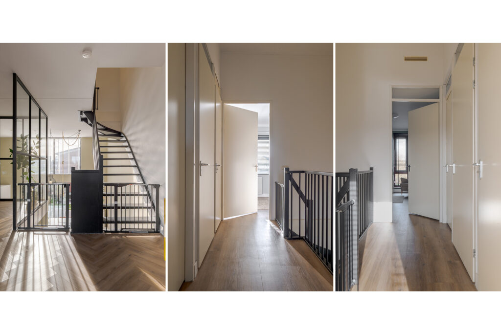 Op de eerste verdieping, bereikbaar middels trap in de keuken, bevindt zich de woonkamer. Door de open blik op de vide is dit een lichte en royale leefruimte. De glaswanden, zwarte details en het speelse lijnenspel van de trap geven het geheel een moderne, industriële uitstraling.